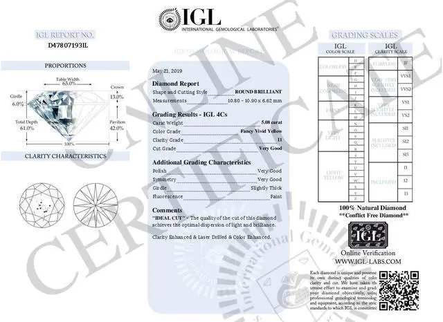 This loose diamond is a winner! She will love this Round shaped loose diamond. The carat weight of the diamond is 5.08. The color of the diamond is Fancy Vivid Yellow (Irradiated) and the clarity is I1(Clarity Enhanced, laser Drilled). The measurements of the diamond are: 10.80 x 10.90 x 6.62. This stone is certified by IGL, cert