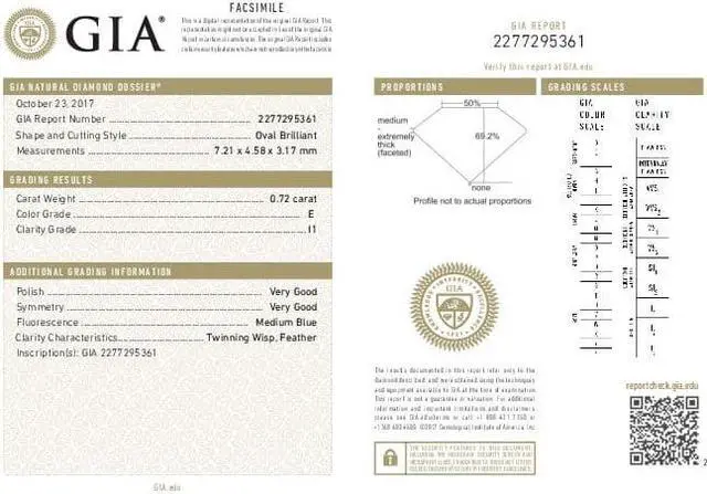 This loose diamond is a winner! She will love this Oval shaped loose diamond. The carat weight of the diamond is 0.72. The color of the diamond is E and the clarity is I1. The measurements of the diamond in mm are: 7.21 x 4.58 x 3.17. This stone is certified by GIA, cert