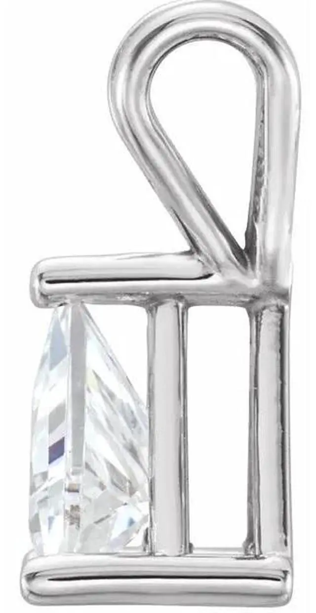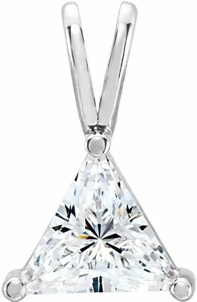 This natural earth mined Triangle shaped Diamond pendant is set in 14k White Gold and comes with a 16 inch chain (upon request we can offer it in 18'' or 20''. To request a different size, please contact us upon purchase, otherwise we will send the pendant in its default chain length). The carat weight of the Diamond is 1.29. The color of the Diamond K and the clarity is SI2. This stone is certified by GIA, cert