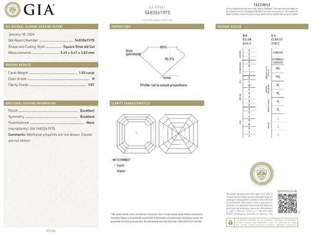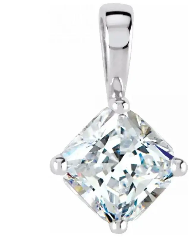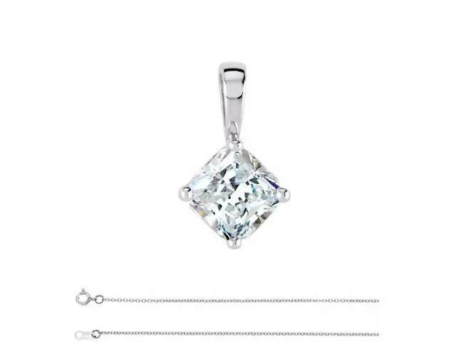 This natural earth mined Asscher shaped Diamond pendant is set in 14k White Gold and comes with a 16 inch chain (upon request we can offer it in 18'' or 20''. To request a different size, please contact us upon purchase, otherwise we will send the pendant in its default chain length). The carat weight of the Diamond is 1.03. The color of the Diamonds H and the clarity is VS1. This stone is certified by GIA, cert