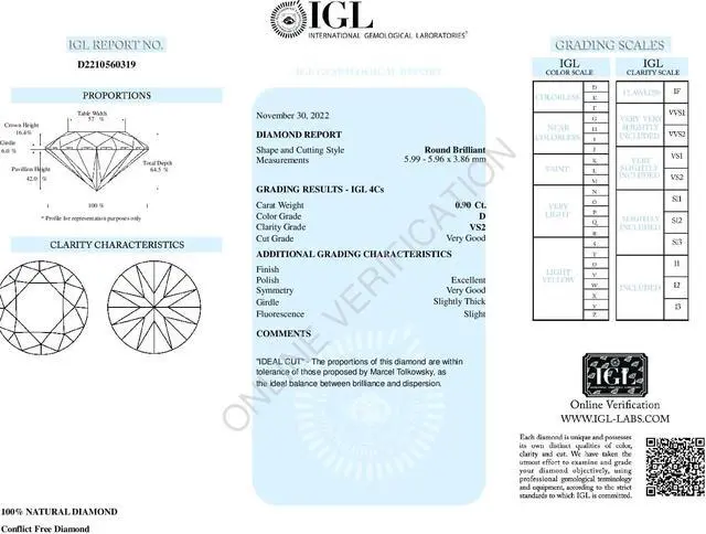 #: D2210560319. The cut grade of the diamond is very good. The polish is Excellent with Very Good symmetry. The depth is 64% with a table width of 57%. This Diamond has Slight fluorescence. This diamond is accompanied by its own certificate, which attests to its authenticity as well as its grading.