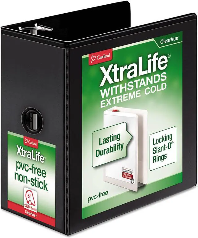 Keep files safe even in extreme temperatures with this Cardinal XtraLife ClearVue 6-inch three-ring view binder. This binder is with 100 percent recycled fiber, so it protects files while helping protect the environment. This Cardinal XtraLife ClearVue 6-inch three-ring view binder has locking slant-D rings that can hold up to 1,300 sheets of paper, making it ideal for storing giant manuals and records.