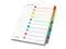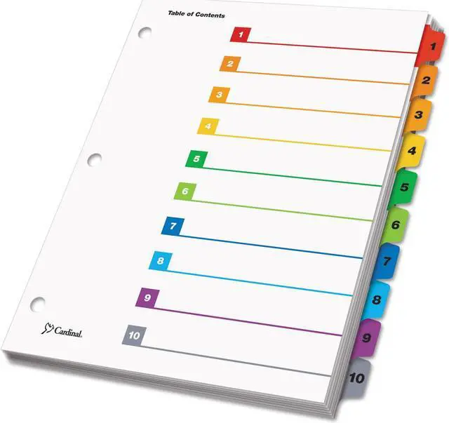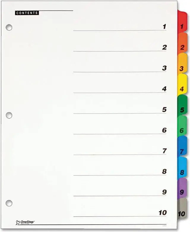 Conveniently and economically packed with six index sets per bag. Instantly create custom index sets by printing onto the Table of Content sheets. Matching, preprinted tabs on the divider sheets can be used in either vertical or landscape formats. Multicolored tab sets have coordinating, multicolored Table of Content sheets. Easy to use, no-cost templates in your favorite software are available online; details on packaging. Tabs and ring edges are reinforced to withstand heavy use. Laser and inkjet compatible. Three hole-punched. Tab Style: 10-Tab; Tab Color(s): Multicolor; Index Divider Size: 11 x 8 1/2; Form Quantity: 1.