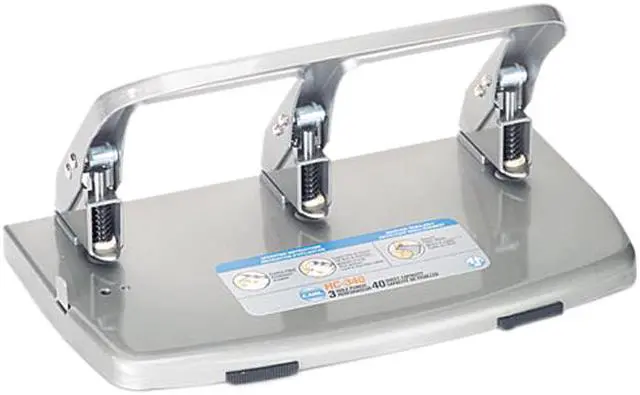 Heavy-duty, three-hole punch drills up to 40 sheets of standard 20 lb. paper. Punch is preset to punch three-hole pattern for three-ring binders. Built-in paper guide ensures perfect positioning. Oversized handle allows easy open-handed punching and locks down for storage and safety. Hole-punch also offers a large capacity waste tray and heavy-gauge steel construction.