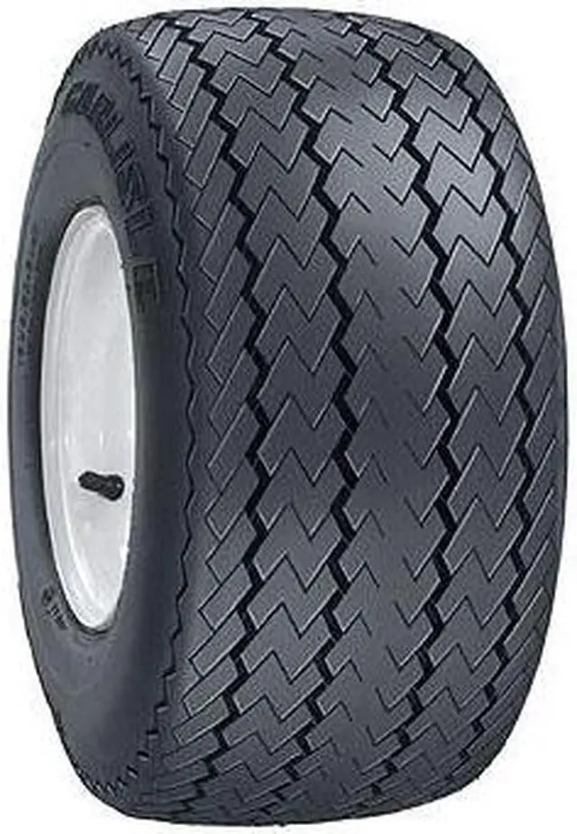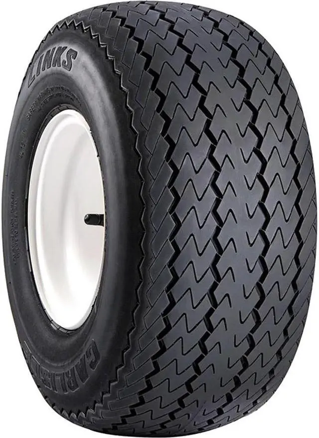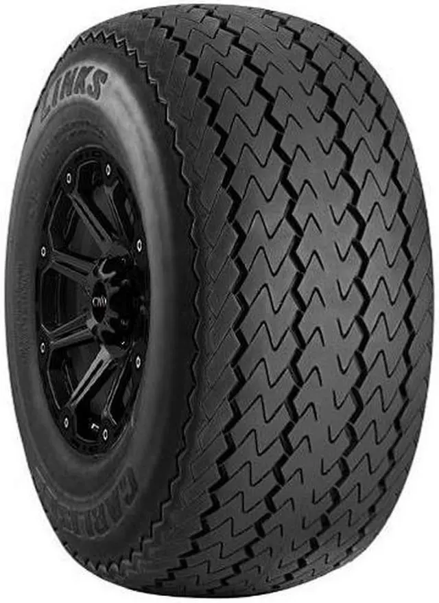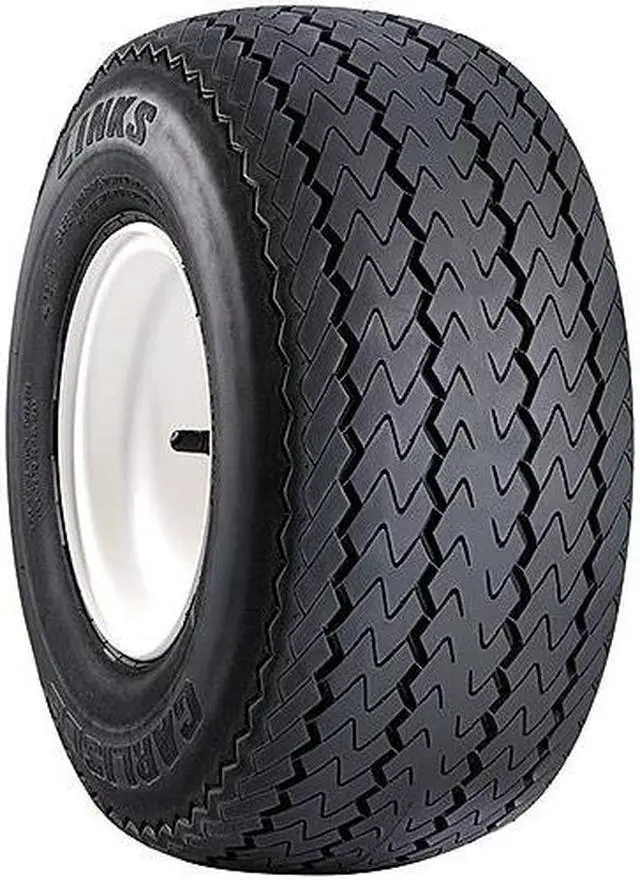 The Carlisle Links is an all season bias ply tire manufactured for golf carts. The tire promotes great all season traction without damaging the grass turf. The maintained surface contact of the wider footprint enhances the model's driving stability by securing the structure against the driving pressure affecting it. The reinforced bias ply sidewall structure prevents the model's deformation under the driving and load pressure affecting the tire. The Links improves the length of the tread life by ensuring a slower even tread wear with the special compound and even pressure distribution.