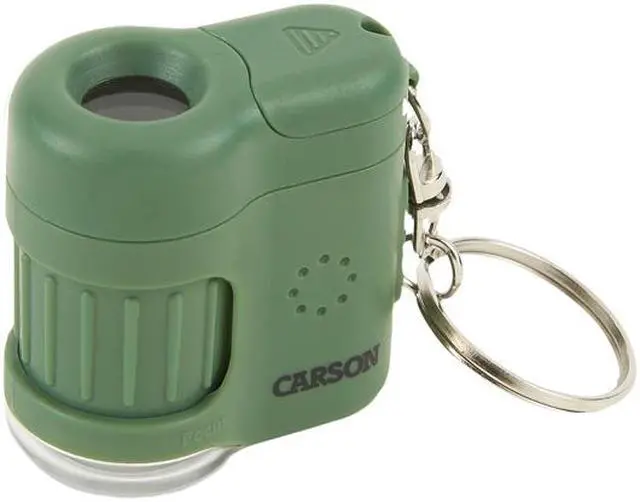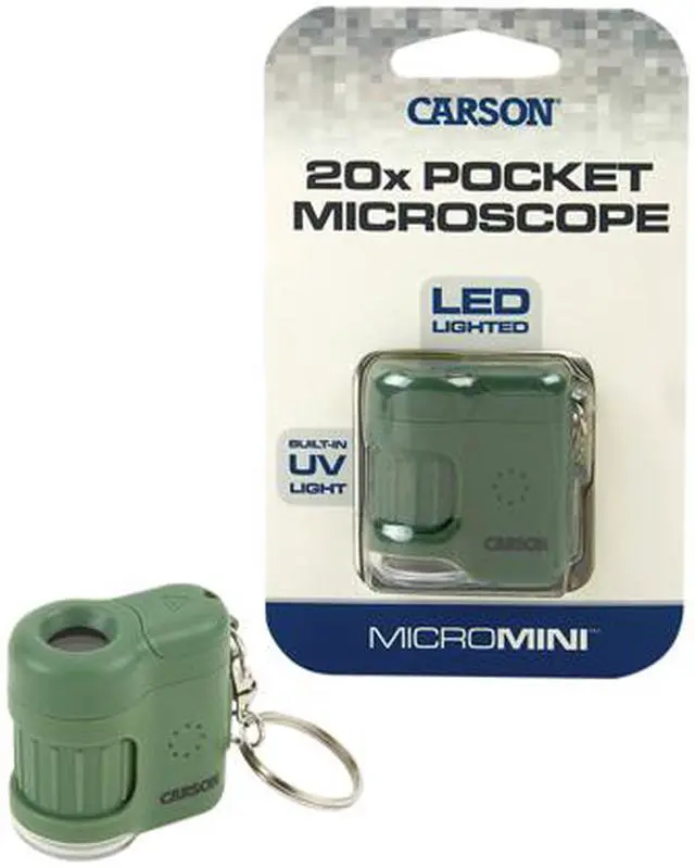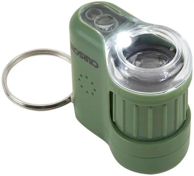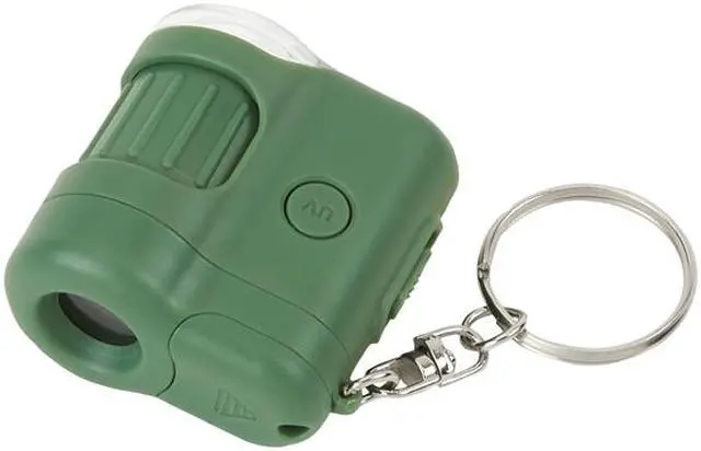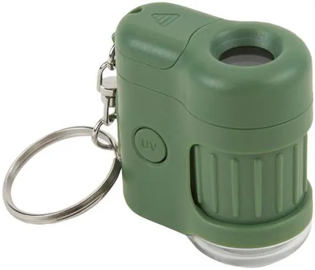 | Features | The MM-280G (Green) MicroMini is a 20X, LED Lighted Pocket Microscope that is always at the ready! It is compact, portable and easy to use. It is so small it can fit in the palm of your hand. Clip on to any hand bag or backpack using the attached key chain. Now you can explore anything, anywhere! View fabric, flowers, foliage, printing pixels and more all up close! View the hidden objects in currency with the included UV light. |