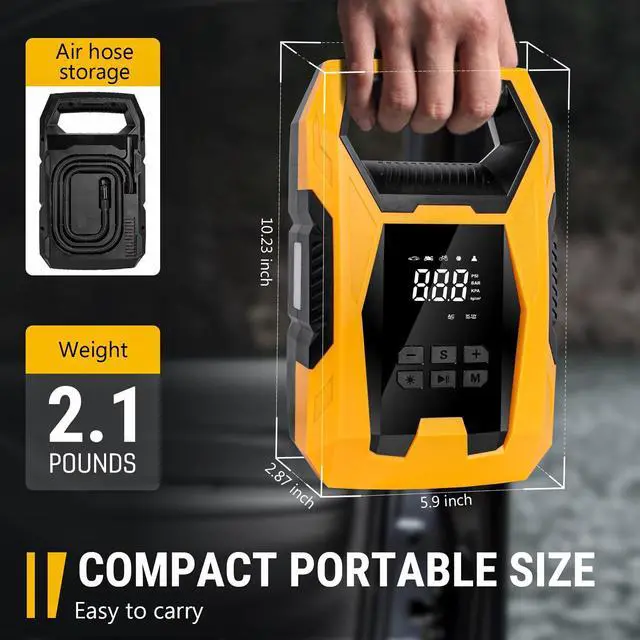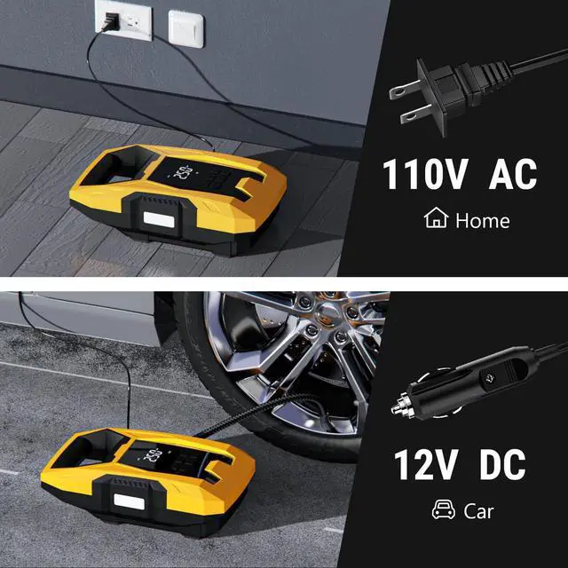Why Choose the CARSUN AC/DC 2-in-1 Tire Inflator? Uncompromised Safety: Getting flattires while on the road is a nightmare for drivers. The CARSUN Digital Tire Inflator helps get you back on the road safely and quickly with its smart and easy-to-use tire inflation function. You dont have to wait for help to arrive when you know you can fix the tire problem yourself with the right equipment. It also helps you save on fuel by preventing driving with uneven tire wear. Its your must-have safety and efficiency partner on the road anytime,anywhere! Works with Multiple Vehicles: CARSUN air pump covers different car sizes and types, from compact sedans to SUVs. Its 10ft cord is long enough to reach all four tires.Its powerful engine can pump up to 150psi enabling it to capably fill car tires in very little time. NOTICE: * The car air pump only works with 12V DC or 110V AC power source. * The car air pump is not applicable to Truck Tires. Intelligent Multi-function: The CARSUN portable air compressor smartly incorporates a LED flashlight, tire pressure gauge and tire inflator in one user-friendly device to ensure and maximize your safety.