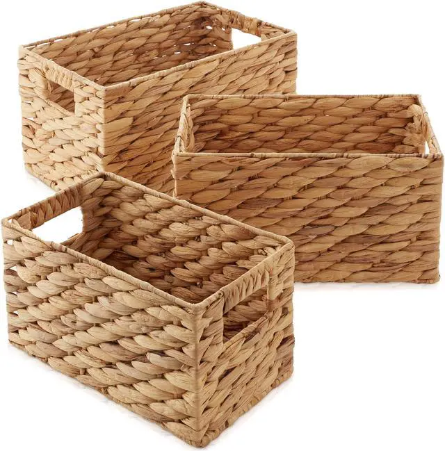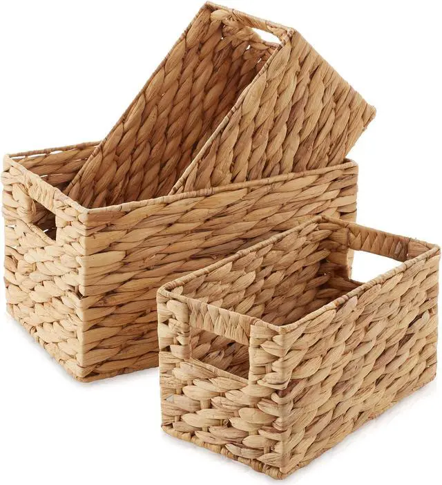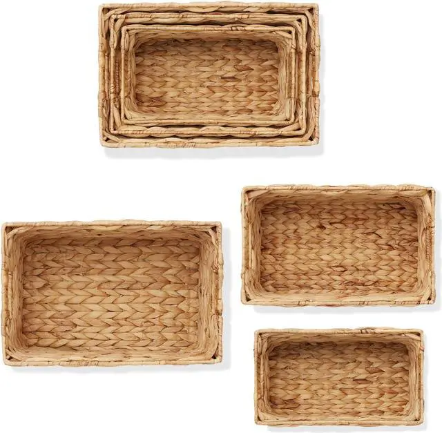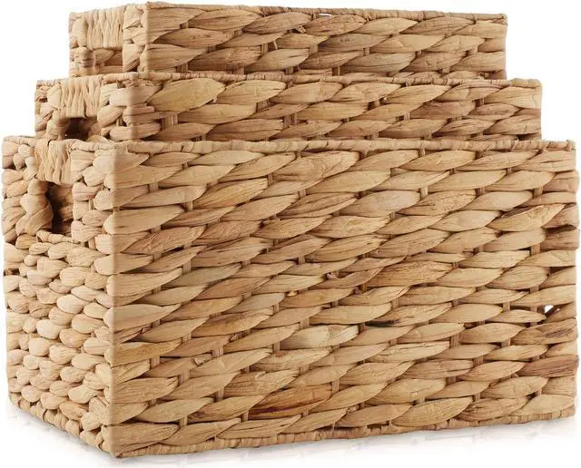 These nesting storage baskets are the perfect combination of functionality, style, and sustainability for your home organization needs. These nested baskets are available in three sizes: small, medium, and large. Instantly organize your pantry, kitchen shelves, bathroom, laundry room, and more with Casafield's rectangular storage baskets. These versatile storage bins are handwoven with eco-friendly water hyacinth and feature handles on both sides for easy access.
