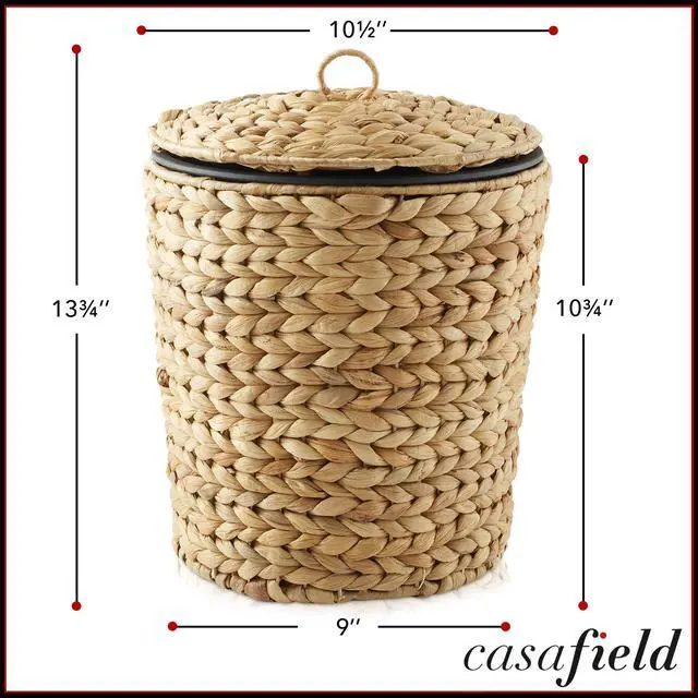 This waste bin from Casafield is meticulously handwoven from 100% natural water hyacinth. Measuring 13-3/4" in height and 10-1/2" in diameter, this stylish trash can is the perfect size for any room, whether its the bathroom, laundry room or home office. Its refined design not only serves a practical purpose but also adds a touch of sophistication to your decor.