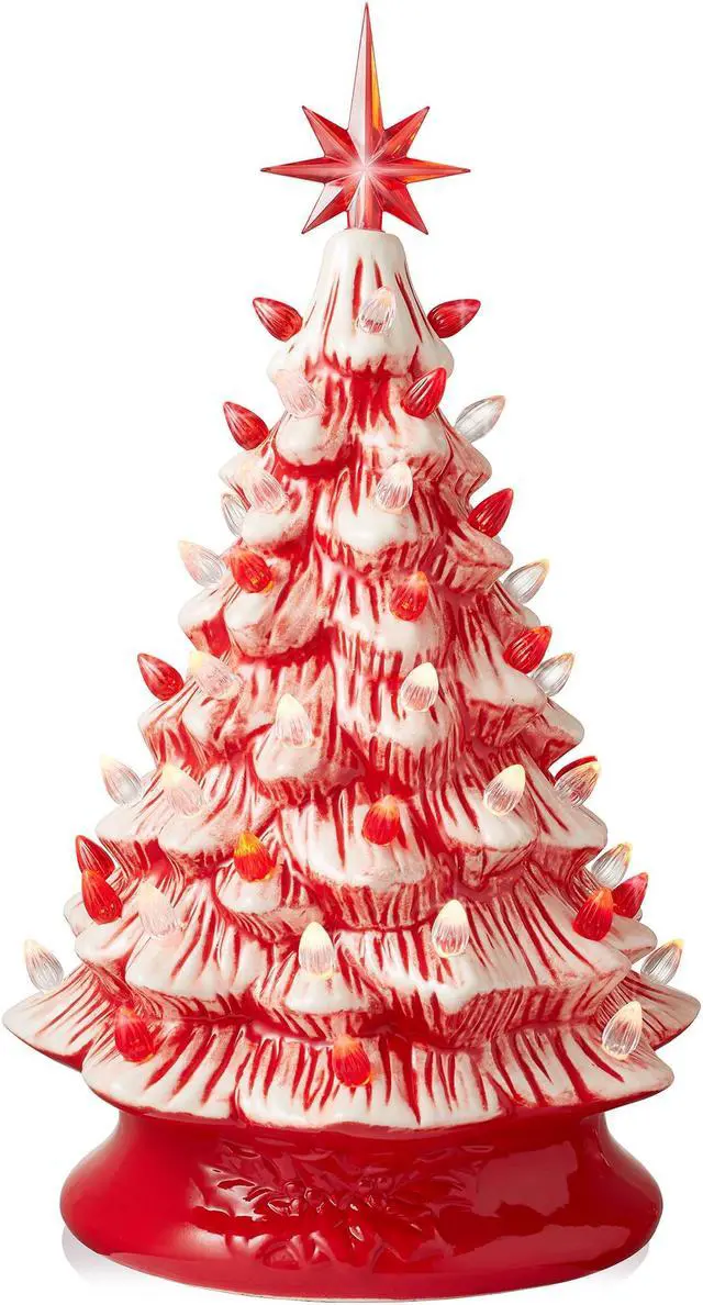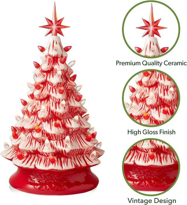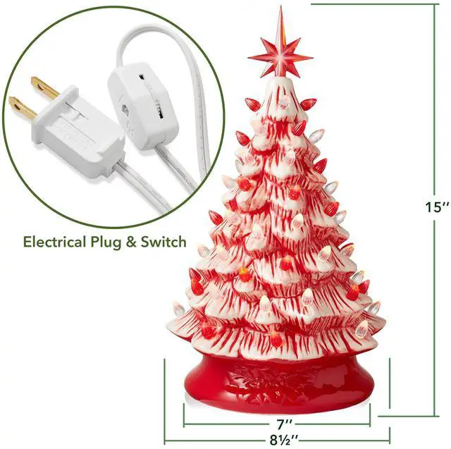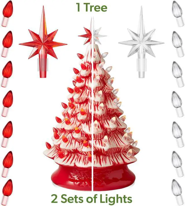 The Casafield ceramic Christmas tree comes with two complete sets of bulbs and toppers giving you two options to decorate as you choose. You can personalize the look of your tree easily, as each bulb sits in a replaceable plastic fitting that keeps it in place. Bulb fittings are provided in two sizes to accommodate slight variations in the hole size. Beautifully hand-painted and crafted from glazed ceramic, this tree features a smooth, high-gloss finish to complement all your best seasonal decorations. The 5 Ft. power cord will keep your tree brightly lit with no need to worry about replacing batteries.