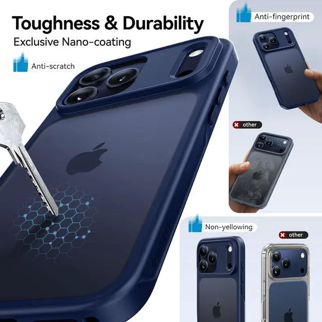 [Frosted & Skily Touch] This Case compatible with iPhone 17 pro adopts a three-layer core process of spraying, electroplating and encapsulation. It not only has a delicate matte frosted touch, which can make you hold comfortably, but also can effectively Anti-Fingerprints & Anti-Scratch & Anti-Oil pollution.