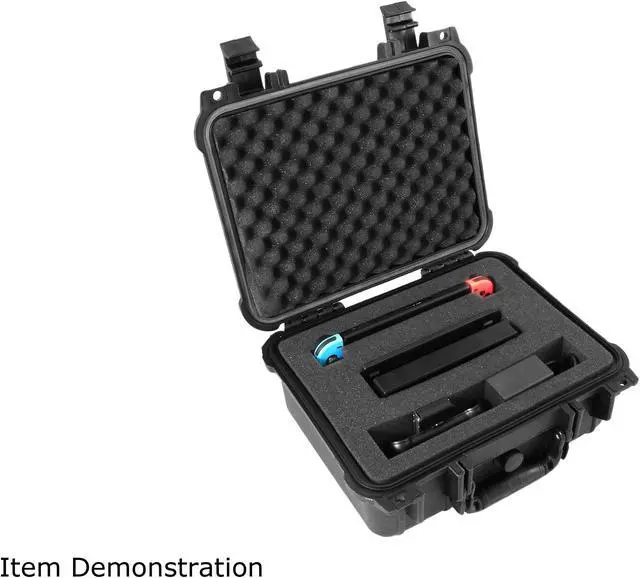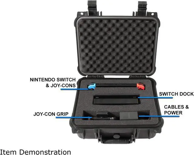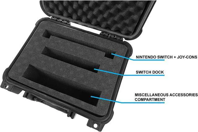 | Features | CASEMATIX Deluxe Nintendo Switch and Accessory Carrying Case Designed For Switch Console With Joy-con's Attached, Switch Dock And Accessory Compartment For Joy-Con Grip, Adapter, Pro Controller and More Rugged, Air-Tight, Water-Proof This hard shell case's exterior is made of High-density polymer for superior external protection against blunt forces, drops and other unforeseen mishaps. Additionally, the case is fitted with an air-tight sealing gasket which locks out water and air to add the highest level of protection to your Console and Accessories. Interior protection consists of a 4.00" Dense Middle Foam With Custom Switch Compartments, a Dense Flat Foam Base (Bottom, 0.40") and a Convoluted Egg-Crate Foam Lid (Top, 1.25"). With a highly durable exterior and dense foam interior, you can be sure your Nintendo Switch and Accessories have reliable storage and protection. Ideal For Travel, Storage and Keeping Nintendo Switch and Accessories Organized The Interior of the case has separate cutouts that are designed to snugly hold the Nintendo Switch Console With Joy-Con Controllers Attached, Switch Charging Dock and an Accessory Compartment Measuring 9.40" x 4.25" x 1.75". You can fit a variety of add ons in the accessory compartment such as the joy-con charging grip, pro controller, ac adapter, charging cables and More. The built in carry handle and dual padlock holes also make it safe and convenient for vacationing, traveling through the airport or just everyday use. This case is compact measuring 13.50" x 11.50" x 5.50" in exterior dimensions and keeps Console and Accessories all safely organized in one place . Protect Your Screen The compartment designed for the Switch Console is made of dense soft foam that protects the screen from scratches and cracks at all time. The absorbing foam also helps prevents damage from vibration that can damage internal electronics and Keeps new. |