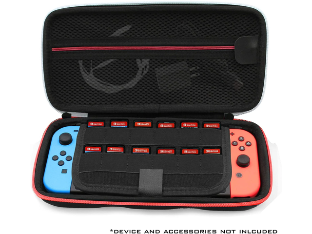- This case features a double-mesh accessory pocket perfect for storing slim chargers, earbuds, wireless controllers and more. The pouch's zipper tucks behind a guard so it never makes contact with your console.