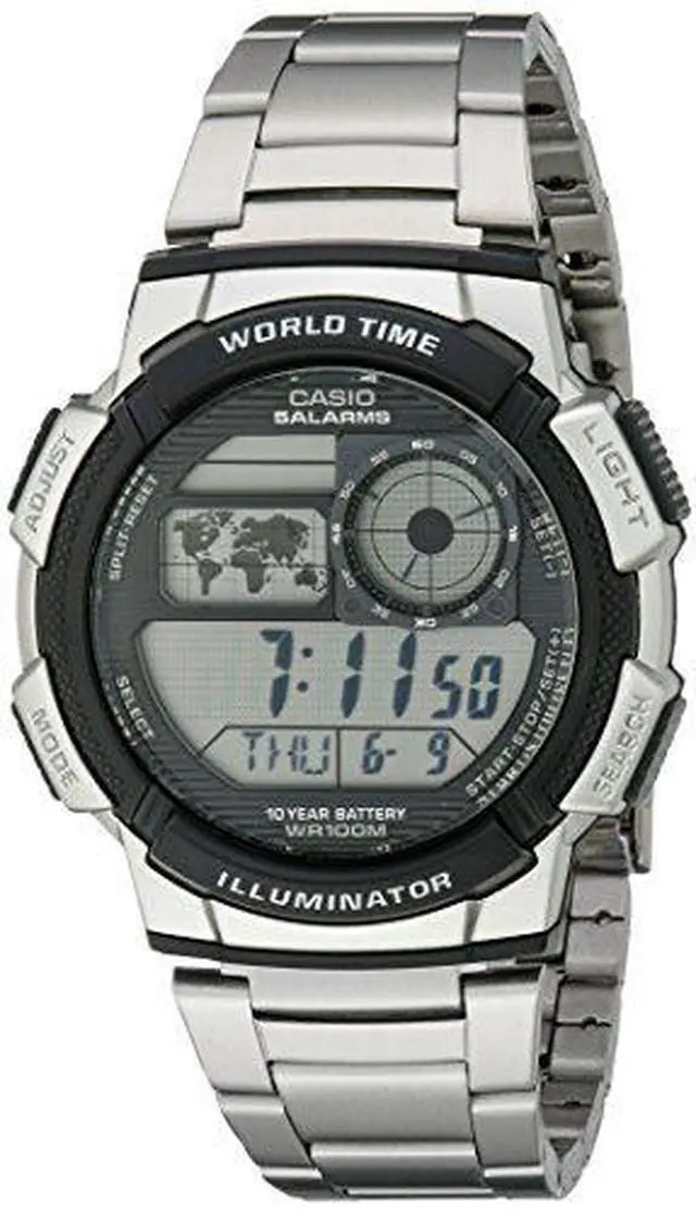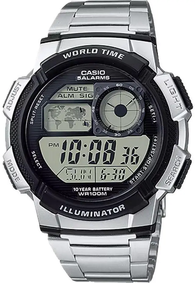 Dial Code: Digital 100M Water Resistant LED Light with Afterglow World Time 31 times zones (48 cities + UTC), daylight saving on/off, home city/world time swapping 5 Alarms (one-time alarm or daily alarm) Hourly Time Signal 1/100 second stopwatch