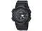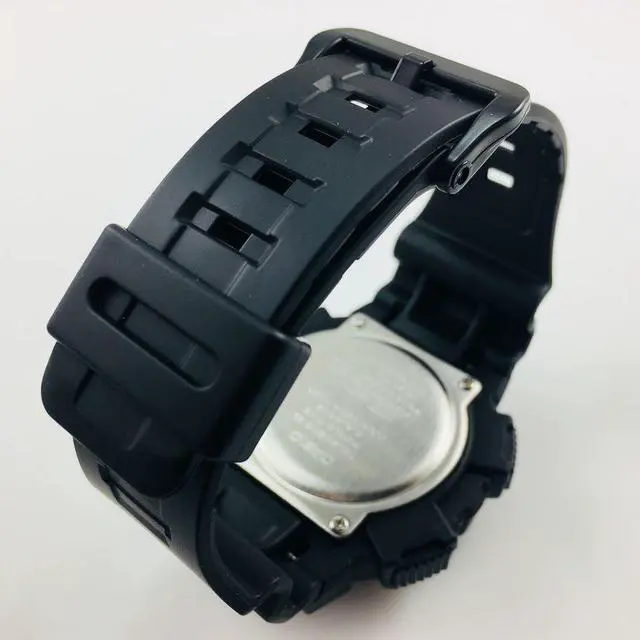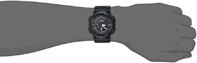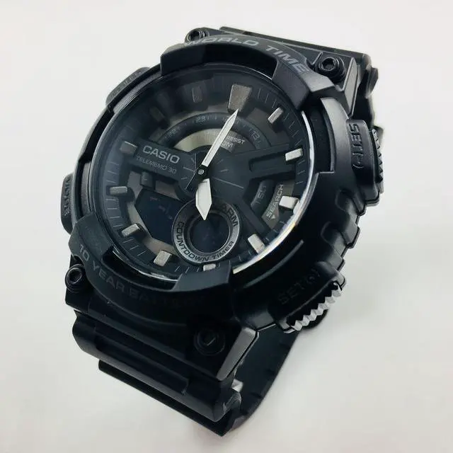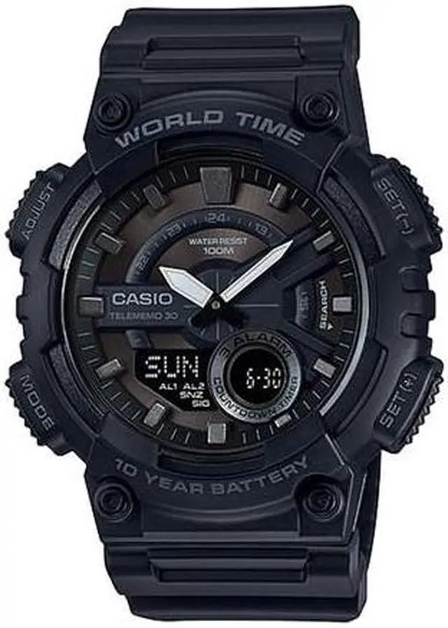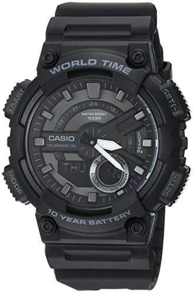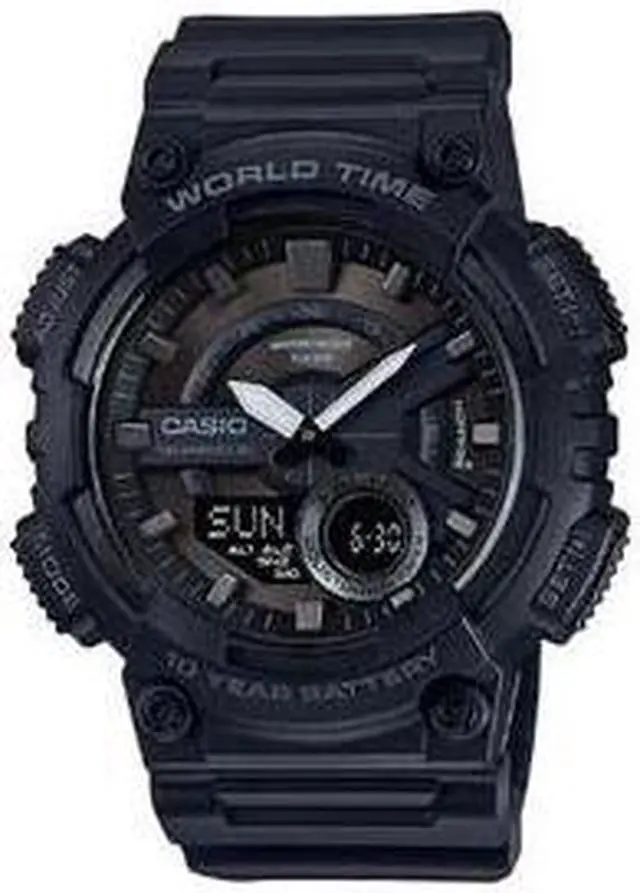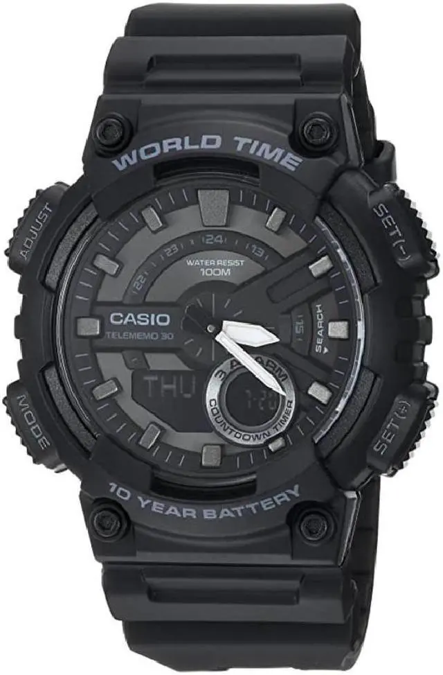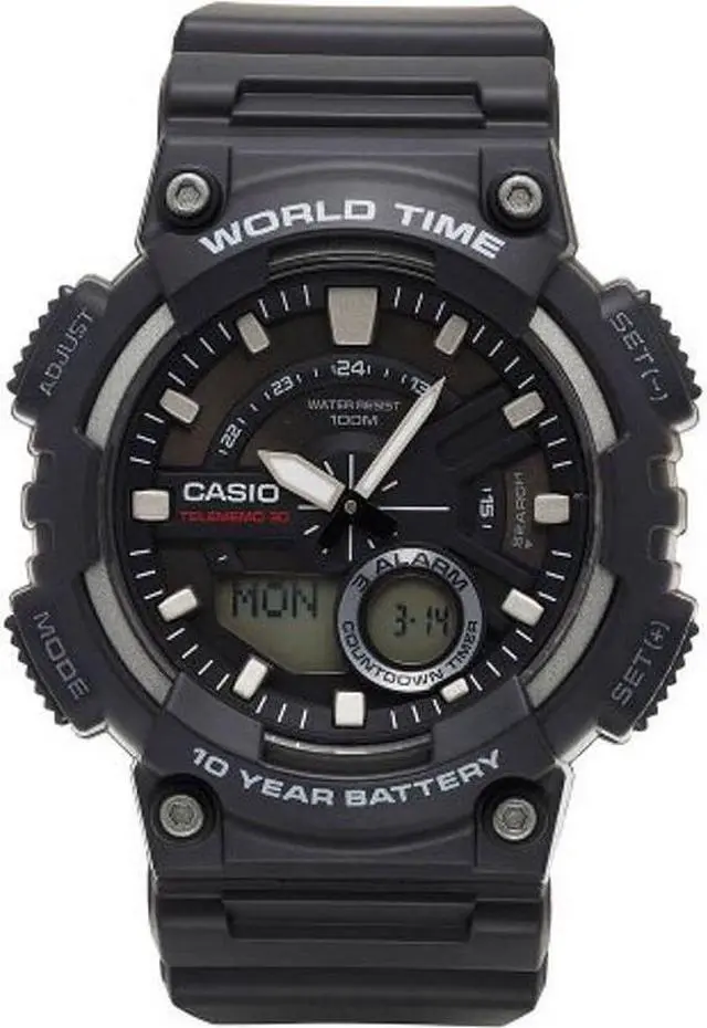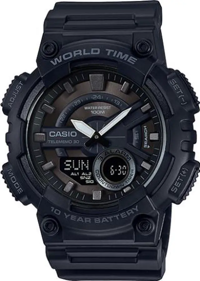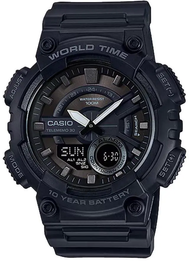 Gents Casio watch collection. Black resin case. Black resin strap. Analog-digital combo dial. 1/100-second stopwatch.