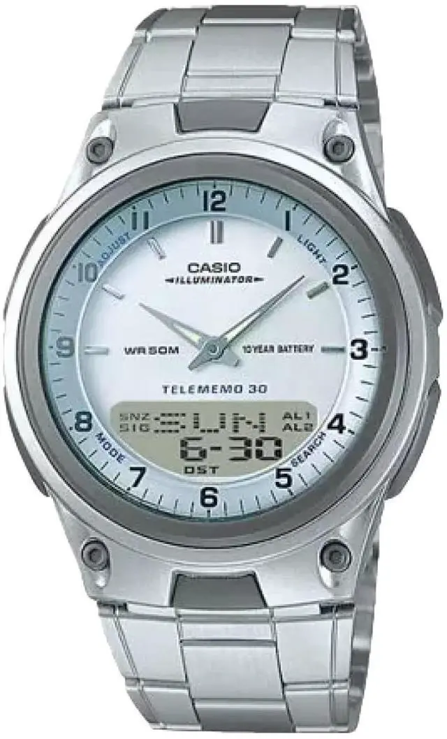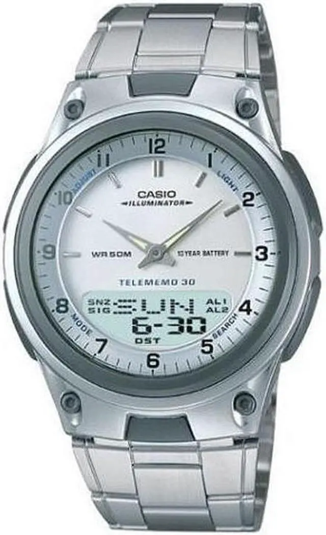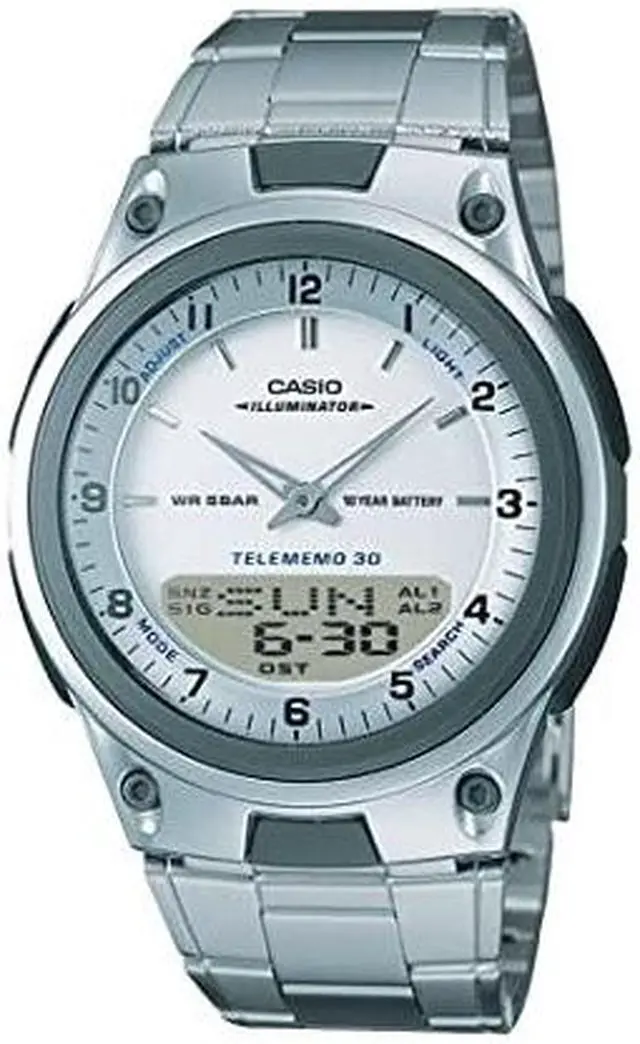 Gents Casio watch collection. Silver tone case. Stainless steel bracelet. Digital Analog display. Telememo 30 (30 telephone numbers memory). World time. Date and calendar display. 2 Daily alarm. Hourly time signal. Stopwatch. Countdown timer. LED light.