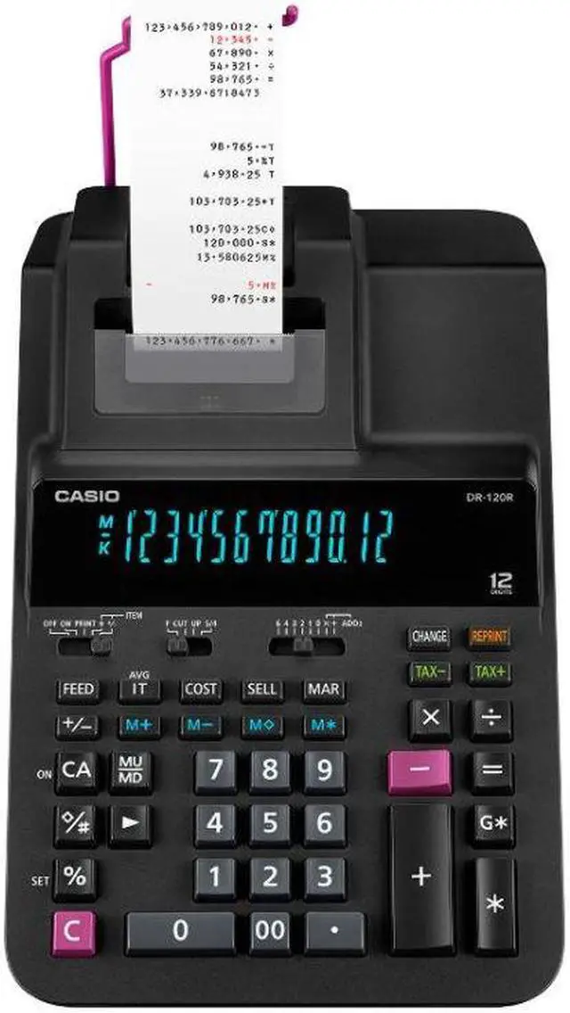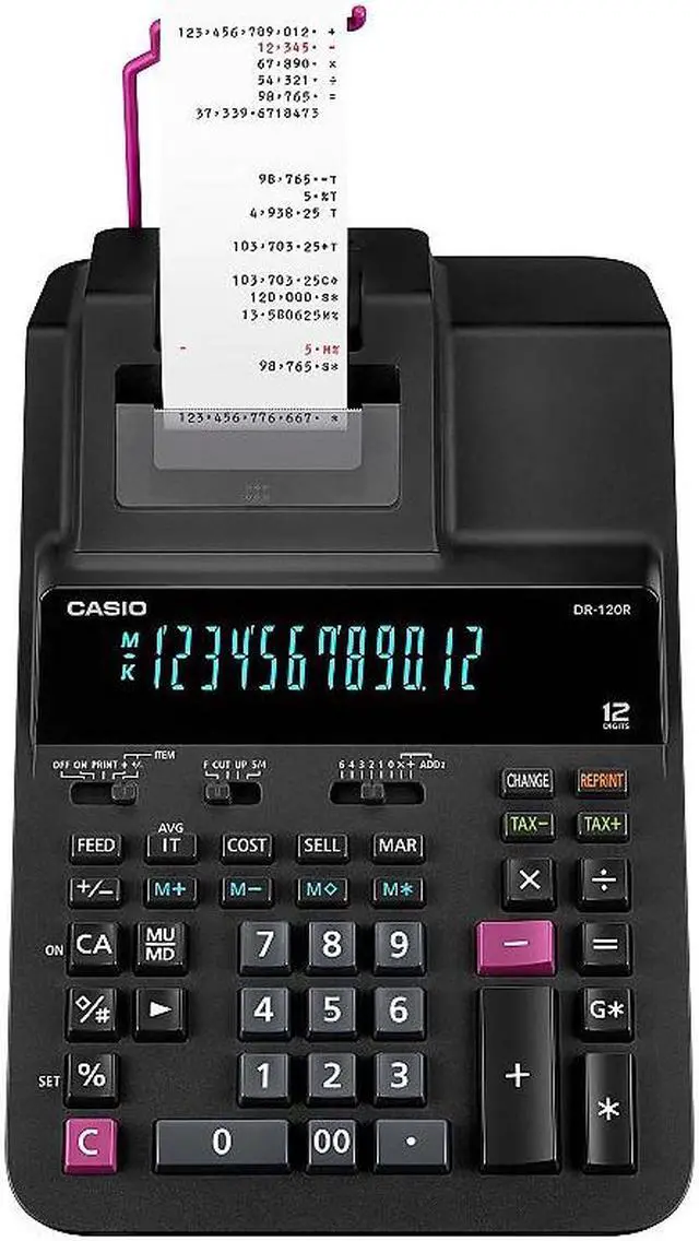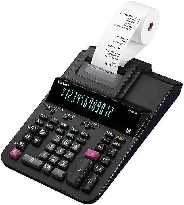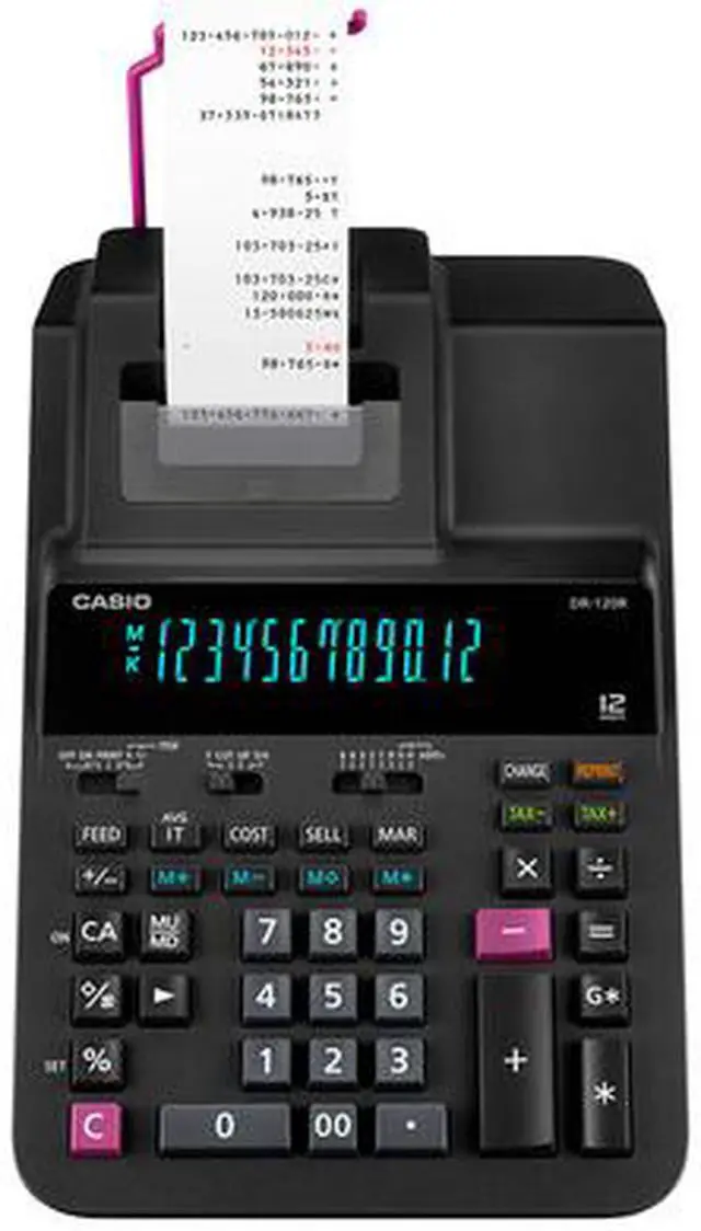 Casio DR-120R Printing Calculator - Dual Color Print - 3.5 lps - Two-color Printing, Independent Memory, Plastic Key, Large Display, Key Rollover - 12 Digits - AC Adapter Powered - 4.4 x 8.1" x 14.8" - Black - Desktop"Operations/Functionality: Item Counter Averages 4-key Independent Memory Mark Up / Mark Down Change function Reprint / After Print Regular percent Dual Color Print: YesPrint Speed: 3.5 lpsCalculator Features: Two-color PrintingCalculator Features: Independent MemoryCalculator Features: Plastic KeyCalculator Features: Large DisplayCalculator Features: Key RolloverNumber of Display Digits: 12Power Source: AC AdapterForm Factor: DesktopColor: BlackHeight: 4.4Width: 8.1"Depth: 14.8"Weight (Approximate): 3.09 lb"