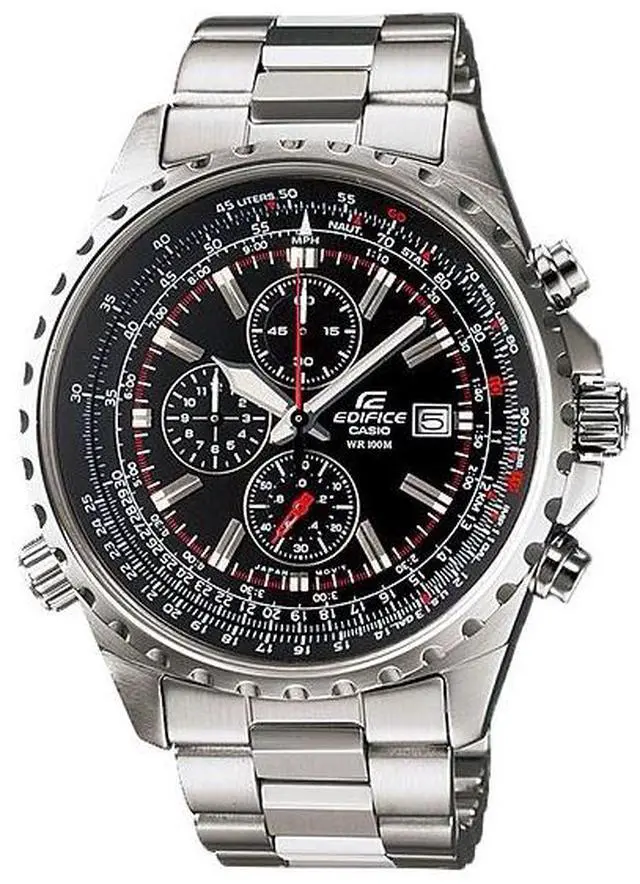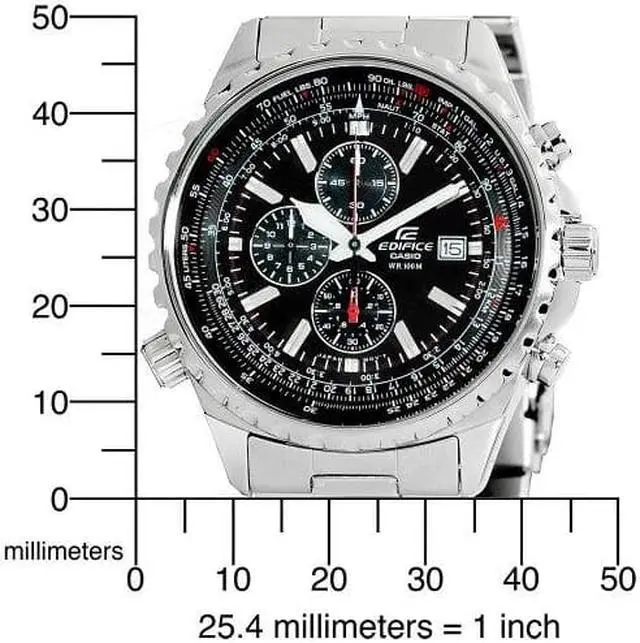 The Casio Men's Edifice Stainless Steel Multi-Function Chronograph Watch exists at the crossroads of comfort, style and functionality…which is where you should be. This dynamic timepiece kicks off with a 45.5 mm stainless steel case and a stationary bezel with a textured edge. There are also pushers on both sides of the case, along with a protected screw-down crown on the right side. The watch's black dial is a flurry of function with a sliding inner bezel, silver-toned hour markers and hands, which are powered by quartz movement. The dial also features three chronograph sub-dials with 12-hour, 60-minute and 60-second displays, along with a date display window at the 3 'o clock position.