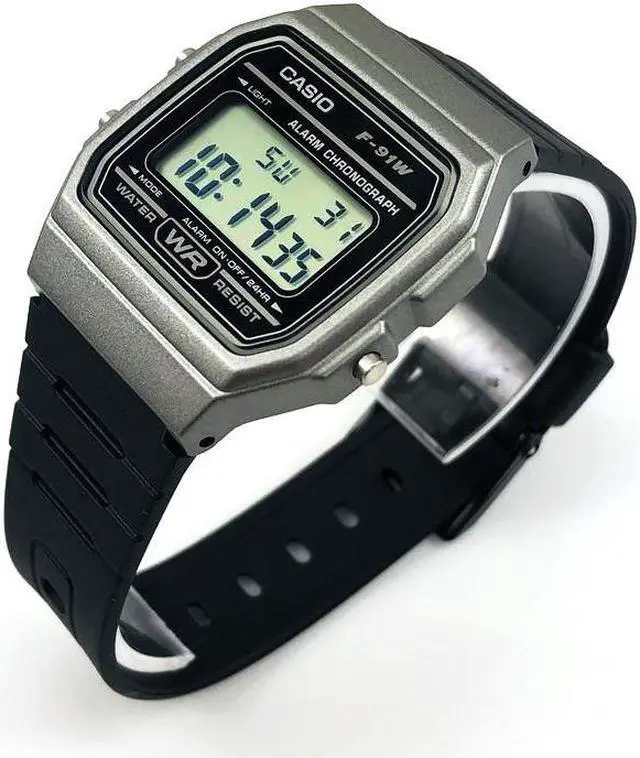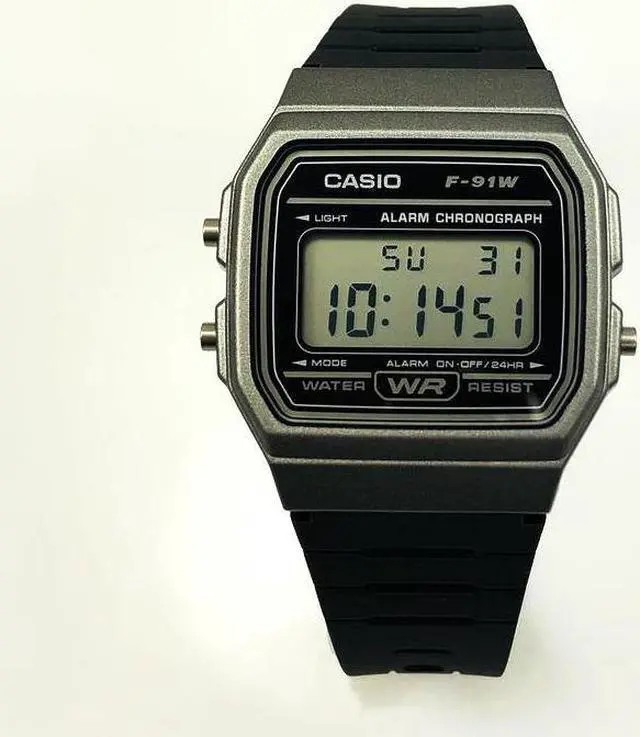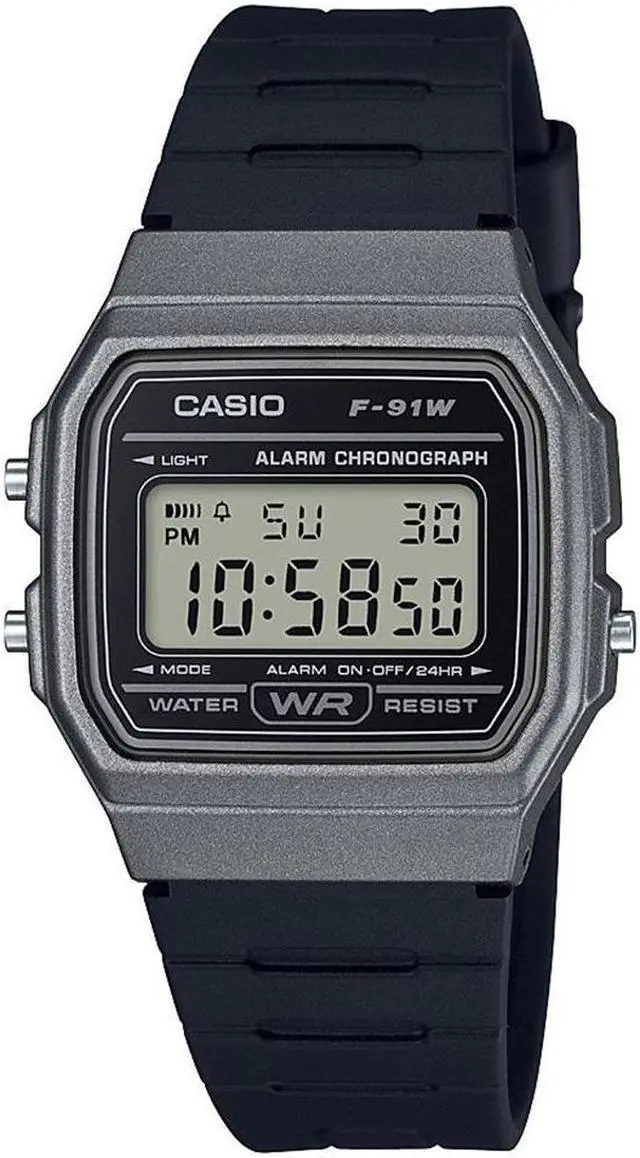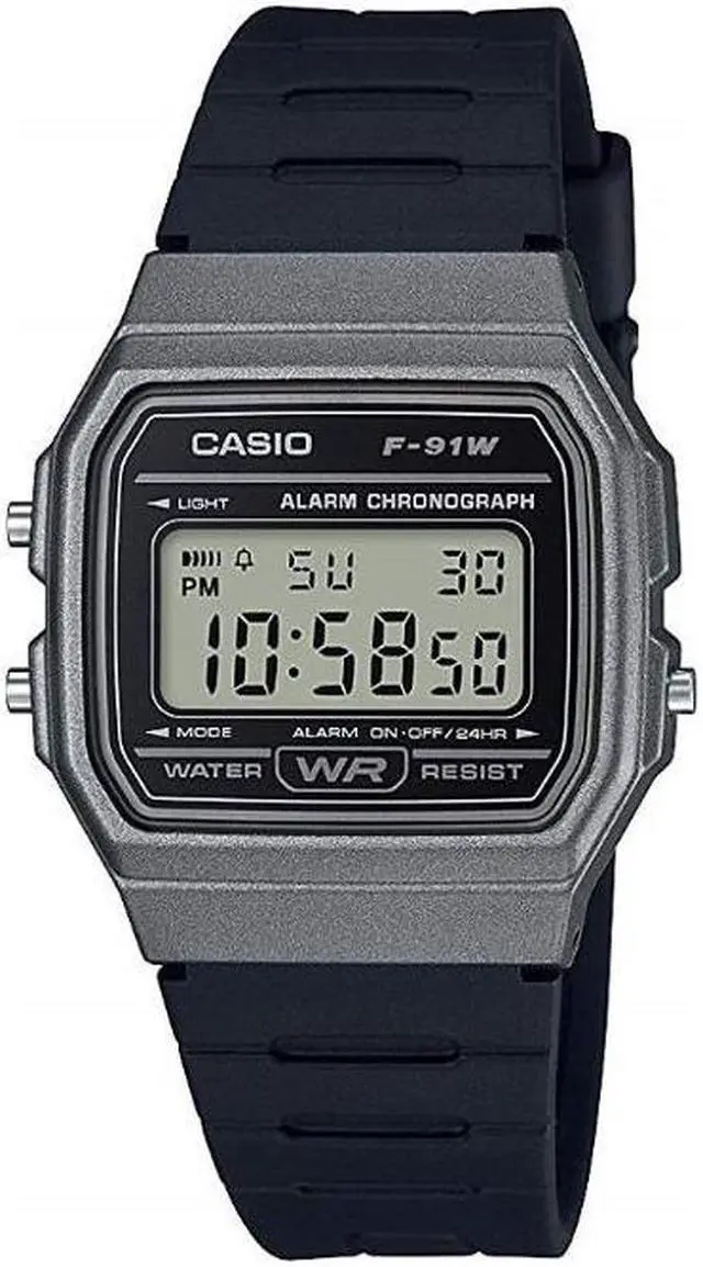 The Casio F-91WM-1BCF is a modern take on the classic F-91W series, featuring a sleek black resin case complemented by a gray bezel. This design offers a contemporary aesthetic while maintaining the lightweight and comfortable fit characteristic of the series. Equipped with an LED backlight, the watch ensures clear visibility of the digital display in various lighting conditions. Its compact dimensions, measuring 38.2 × 35.2 × 8.5 mm and weighing approximately 21 grams, make it an unobtrusive accessory suitable for daily wear. The F-91WM-1BCF offers essential functions such as a 1/100-second stopwatch, daily alarm, hourly time signal, and an auto-calendar pre-programmed until the year 2099.