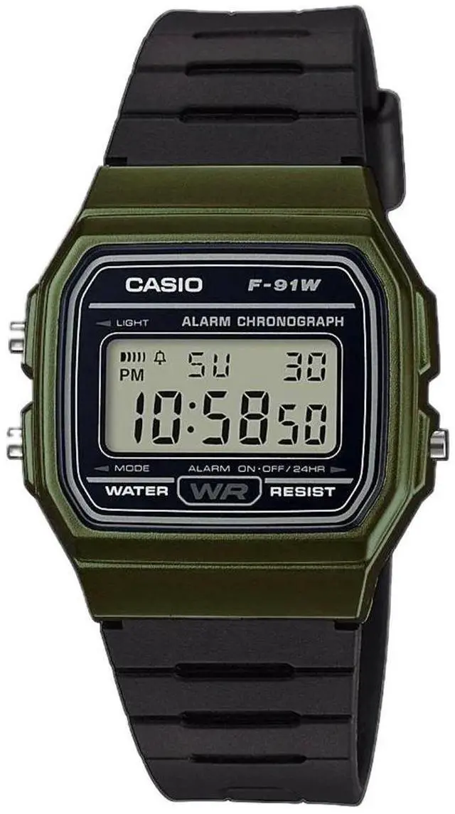 The Casio F-91WM-3ACF is a modern twist on the classic F-91W series, featuring a distinctive metallic green resin case that adds a contemporary flair to its timeless design. This watch maintains the lightweight and comfortable fit characteristic of the series, making it suitable for daily wear. Equipped with an LED backlight, the F-91WM-3ACF ensures clear visibility of the digital display in various lighting conditions. Its compact dimensions, measuring 38.2 × 35.2 × 8.5 mm and weighing approximately 21 grams, make it an unobtrusive accessory on the wrist. The watch offers essential functions such as a 1/100-second stopwatch, daily alarm, hourly time signal, and an auto-calendar pre-programmed until the year 2099.