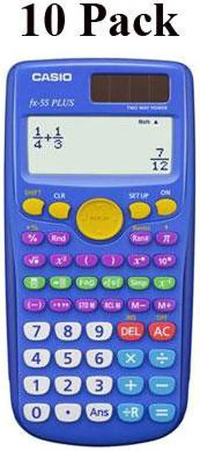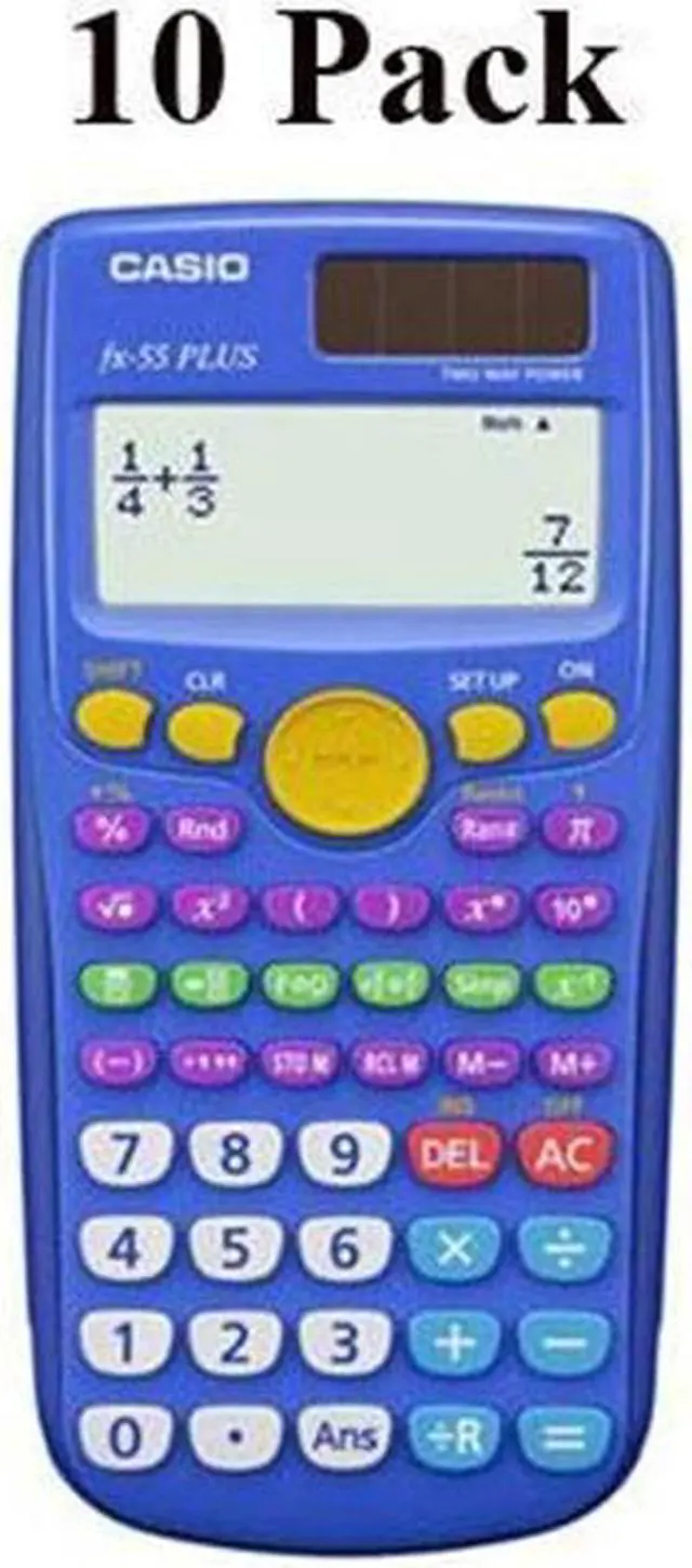 At A Glance With Natural Textbook Display, the fx-55 PLUS helps students learn elementary mathematics such as Fraction, Division with Remainder and Random numbers. True Fraction Display helps student understand the mathematics behind improper fractions, mixed fractions and simplification. Intuitive functions Fraction simplification Easy fraction/decimal conversion Product Type: Scientific Calculator Power Source: Battery Product Type: Scientific Calculator Manufacturer Part Number: FX55PLUS-TP Power Source: Battery Limited Warranty: 1 Year Weight (Approximate): 4.85 lb Length: 6 Length: 6 Manufacturer: Casio Computer Co., Ltd Product Model: fx-55Plus Product Name: fx-55Plus Scientific Calculator Brand Name: Casio Calculator Features: Textbook Display Calculator Features: Hard Shell Cover Brand Name: Casio Calculator Features: Textbook Display Calculator Features: Hard Shell Cover Height: 2.2 Width: 5.3 Height: 2.2 Width: 5.3 Operations/Functionality: Math I/O Linear I/O Backspace Shift Clear Restart Replay Memory Fraction Calculation Percentage Logarithm Power & Root Random Integer Basic Calculation Addition Subtraction Multiplication Division (With Reminder) Pi Negative Sign