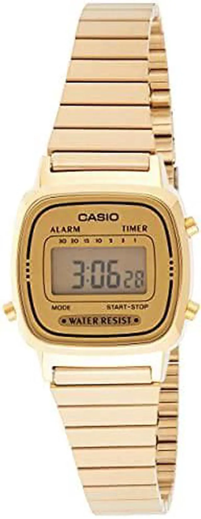 The Casio LA-670WGA-9D is a vintage-inspired digital watch that brings timeless charm to modern style. Featuring a gold-tone stainless steel bracelet and compact square case, this watch perfectly balances elegance and functionality. With built-in stopwatch, daily alarm, countdown timer, and auto calendar, its both stylish and practical for everyday use.