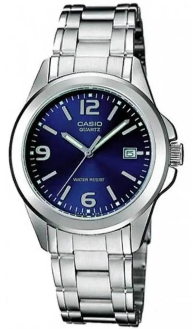 The Casio LTP-1215A-2A is a sleek and subtle analog watch for women who favor minimalist elegance. It features a stainless steel bracelet paired with a blue dial and date display at 3 oclock. Housed in an ion-plated case and safeguarded by mineral glass, this timepiece offers everyday usability with refined styling. Water resistance is included for light moisture exposure such as rain or hand-washing