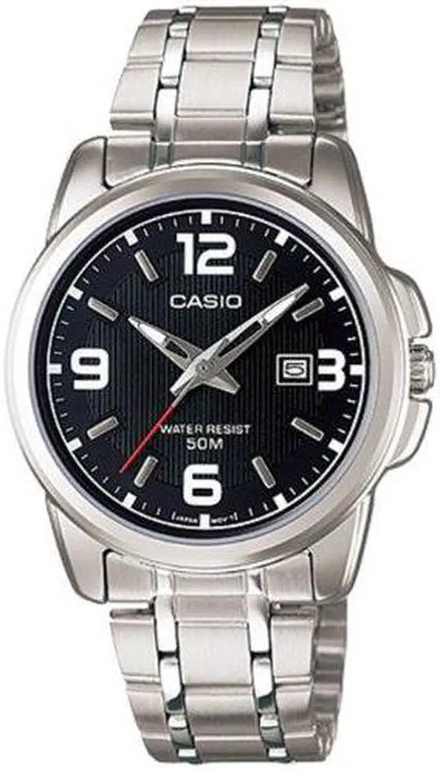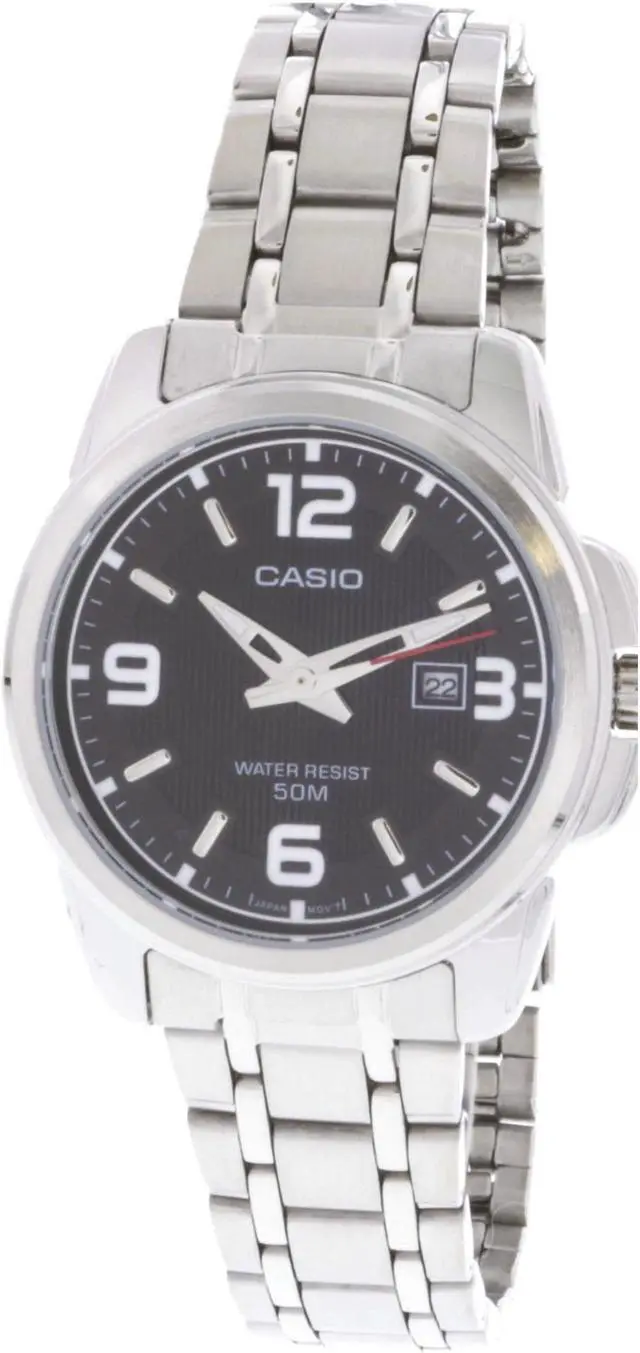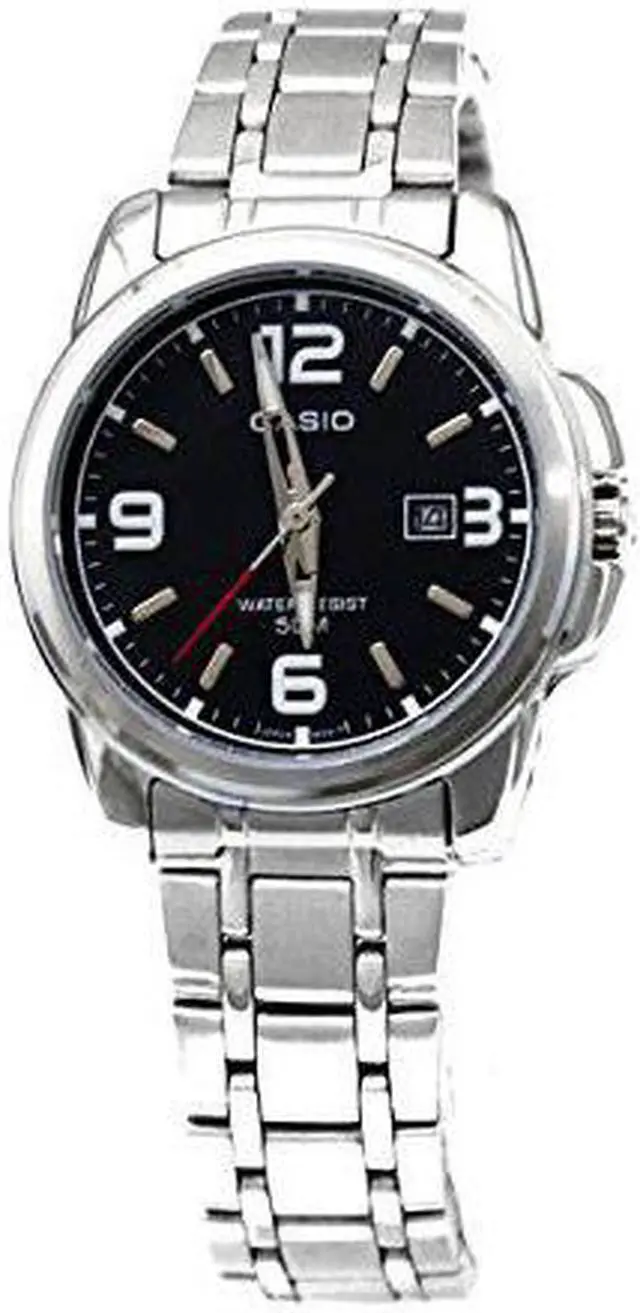 Complete your watch collection with this beautiful timepiece. CASIO LTP-1314D-1AVDF FEATURES: Series: Standard, Style: Casual, Case: Polished stainless steel, Dial Color: Black, Clasp Type: Deployment, Movement: Quartz (Cal. 3363), Crystal: Mineral, Case Diameter: 31 mm, Case Thickness: 9 mm, Case Back: Snap-down stainless steel, Water Resistant: 50M, Crown: Push/Pull, Calendar: Date display at 3:00, Bracelet Width: 14 mm, Bracelet Length: Up to 8.5 inches, Hands: Silver tone and luminous hour and minute. Silver tone and red second, Material: Stainless steel, Weight: 67g, Markers: White Arabic numerals. Silver tone indices, Gender: Women's, Case Shape: Round, Bracelet Color: Silver, Bracelet Material: Brushed and polished stainless steel