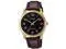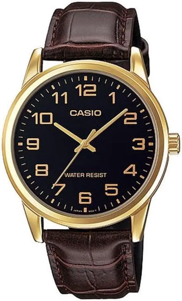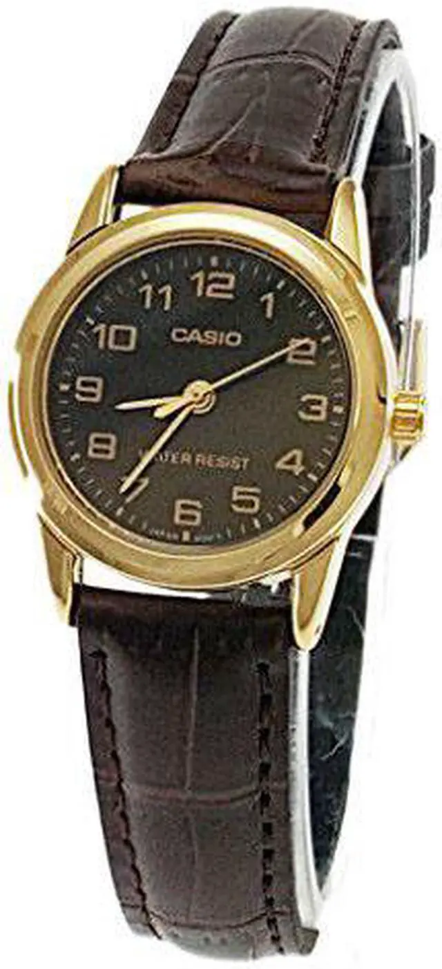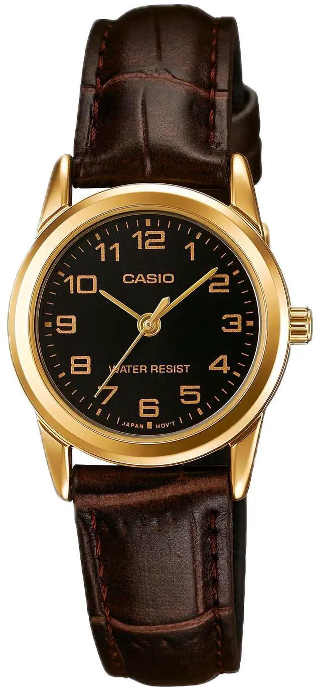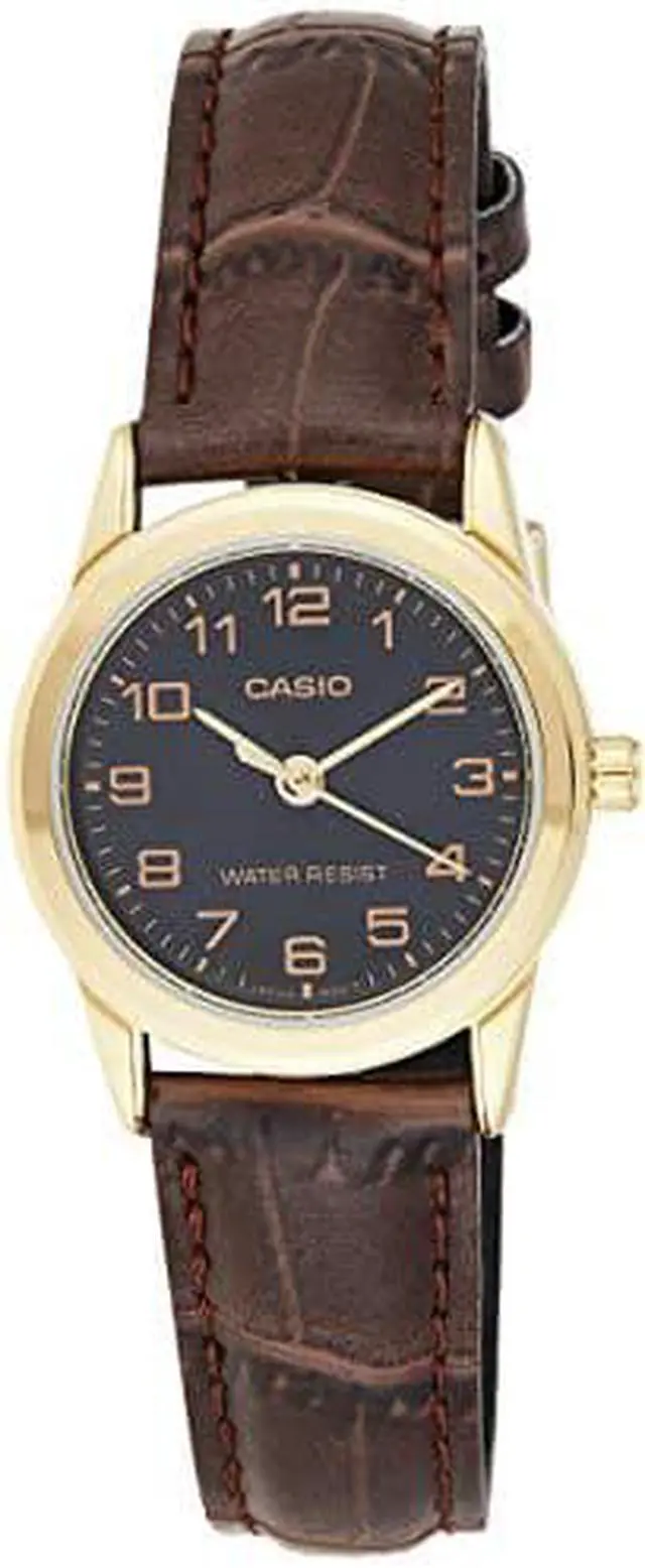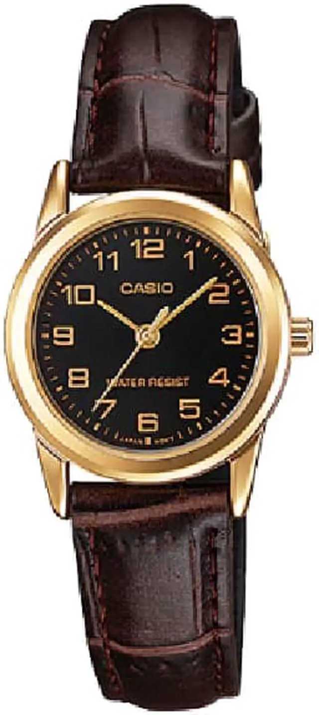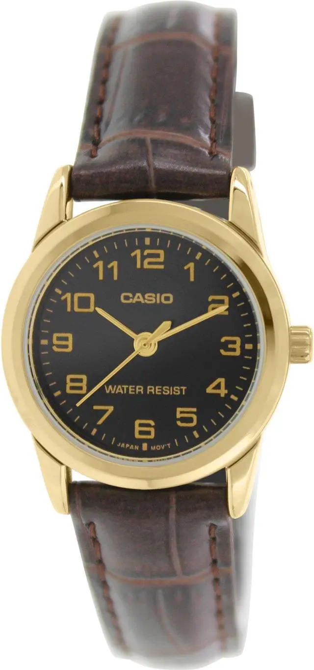 The Casio LTP-V001GL-1B is a timeless analog watch designed for women who appreciate elegant simplicity and everyday versatility. It features a black dial with a gold-tone stainless steel case and a brown genuine leather strap, creating a warm and classic contrast. With its clear three-hand analog display, mineral glass protection, and water-resistant design, this watch offers both style and reliability for daily wear.