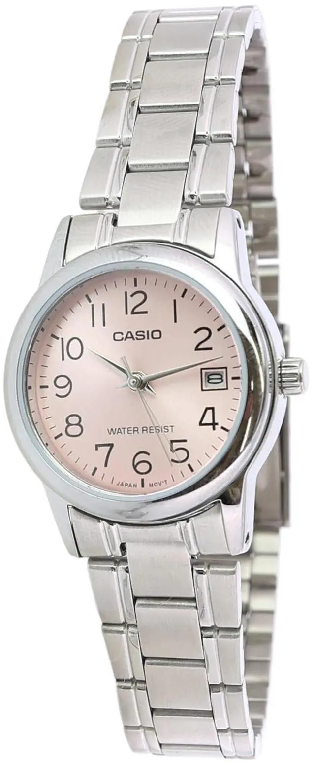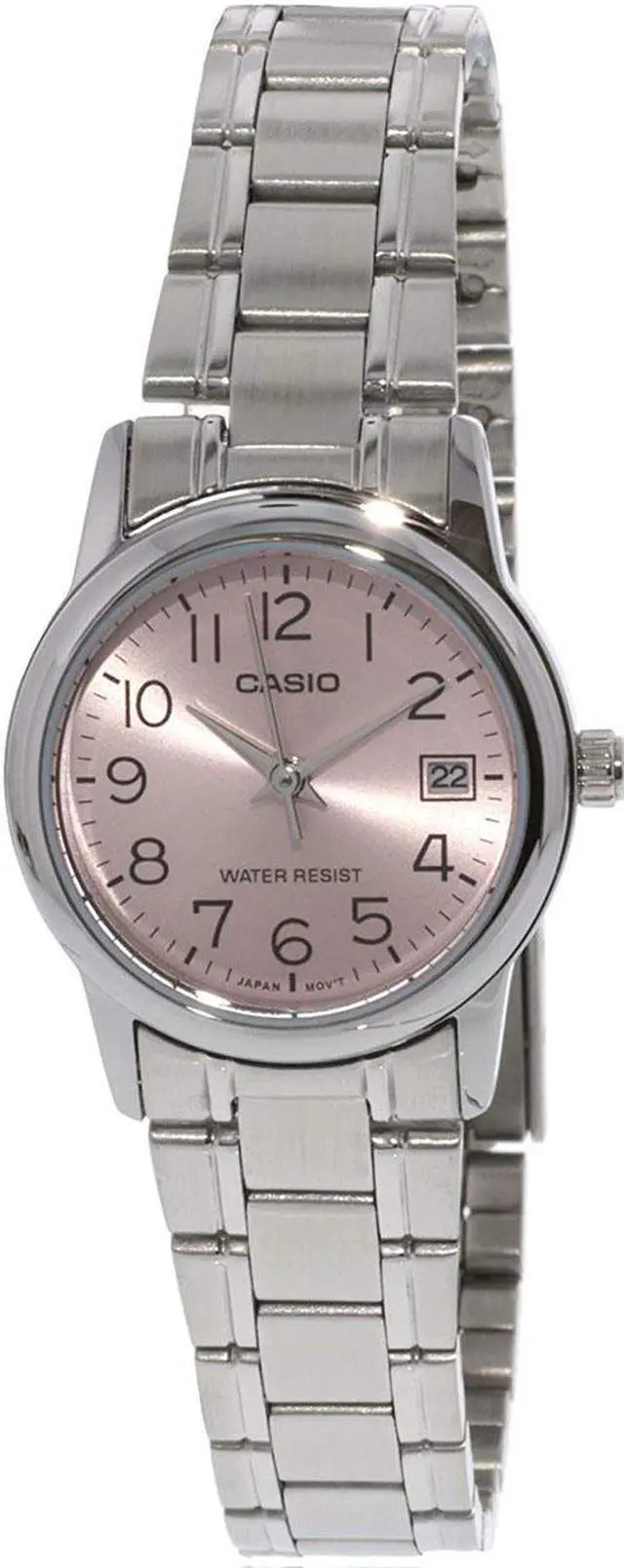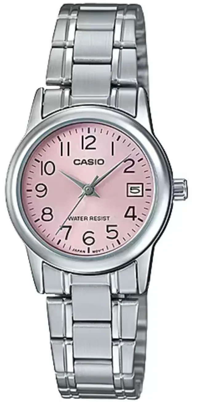 Round pink dial Silver tone hands and Arabic hour markers Date window at 3 o'clock position Stainless steel case Push crown Mineral crystal Stainless steel bracelet with foldover clasp Japan quartz movement Water resistant Case diameter: 25mm Case thickness: 9 mm Band width: 14mm