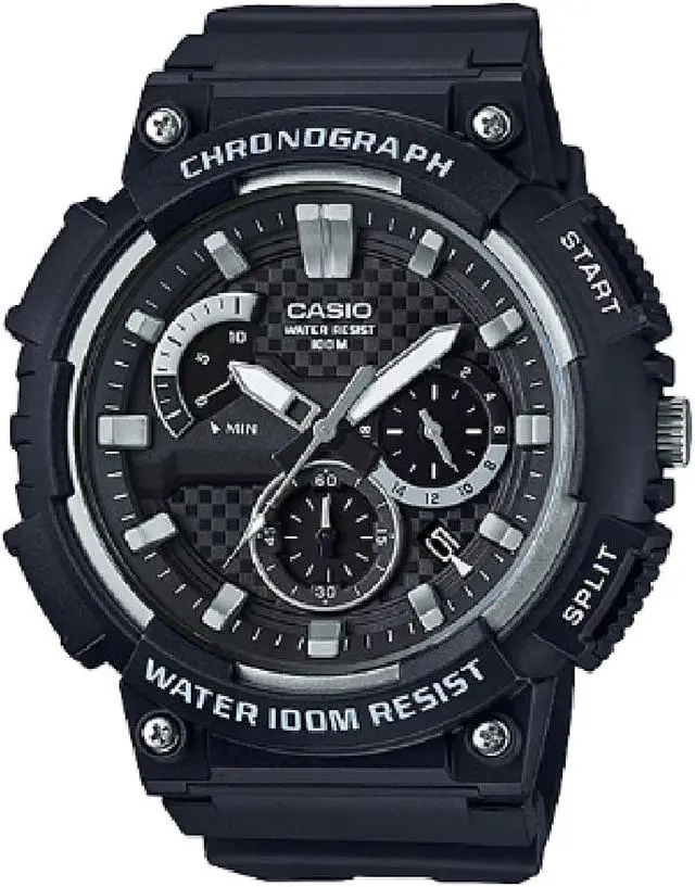 The Casio MCW-200H-1AV is a robust and stylish chronograph watch designed for men seeking both functionality and durability. It features a black resin case and band, complemented by silver accents on the dial, creating a sleek and modern appearance suitable for various occasions. The watch is equipped with a retrograde chronograph and a 1-second stopwatch with a measuring capacity of up to 9 minutes and 59 seconds, making it ideal for precise time tracking during various activities. A date display is conveniently positioned on the dial for easy reference. With a water resistance of up to 100 meters, this timepiece is suitable for swimming and snorkeling.