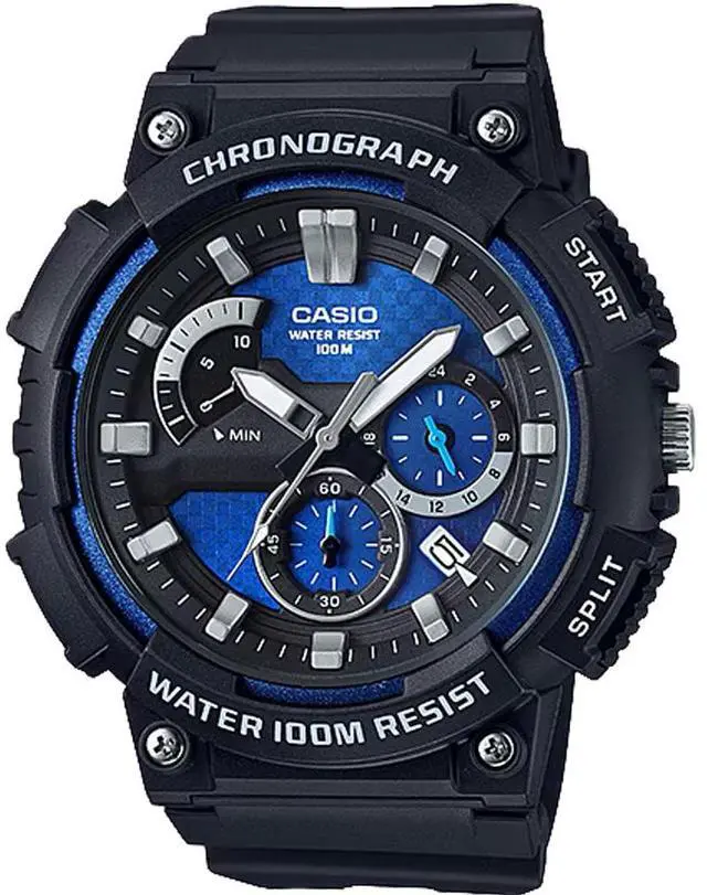 The Casio MCW-200H-2AV is a robust and stylish chronograph watch designed for men seeking both functionality and durability. It features a black resin case and band, complemented by a blue dial with silver accents, creating a sleek and modern appearance suitable for various occasions. The watch is equipped with a retrograde chronograph and a 1-second stopwatch with a measuring capacity of up to 9 minutes and 59 seconds, making it ideal for precise time tracking during various activities. A date display is conveniently positioned on the dial for easy reference. With a water resistance of up to 100 meters, this timepiece is suitable for swimming and snorkeling.