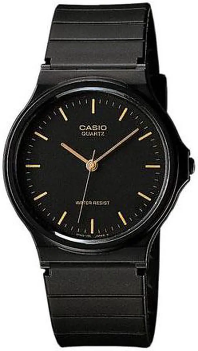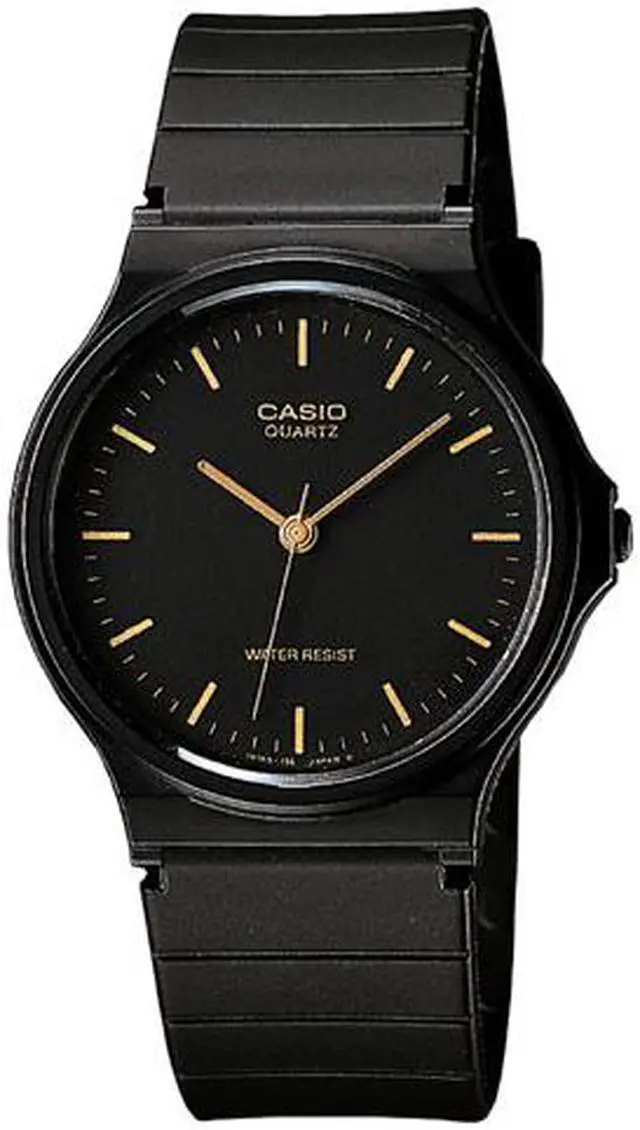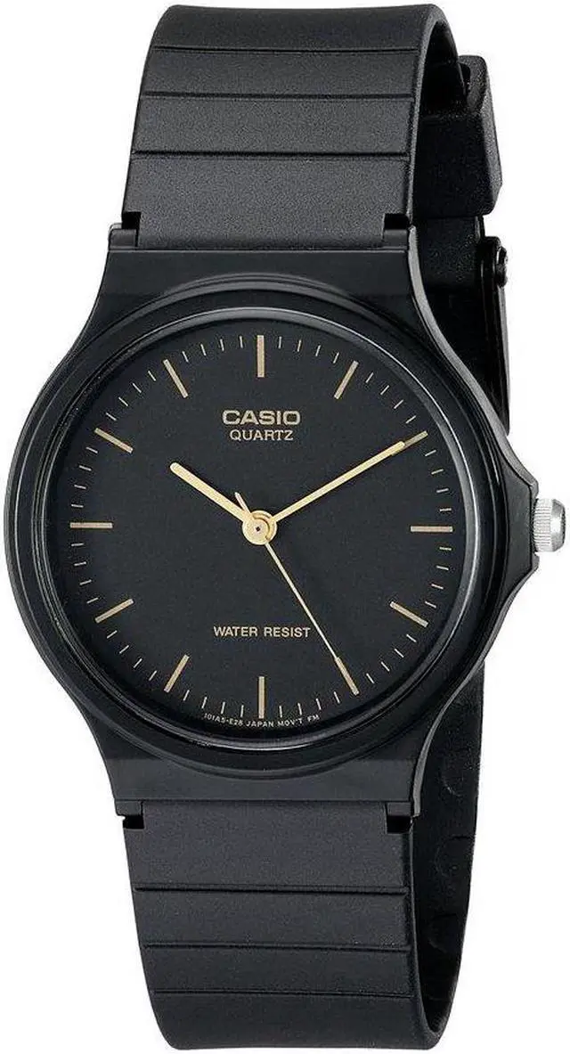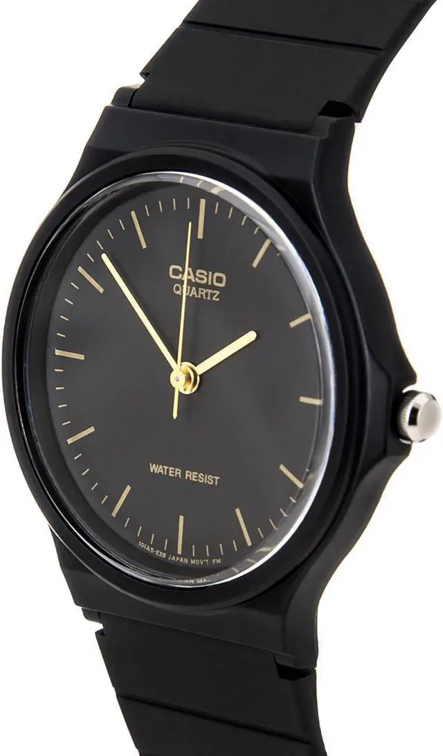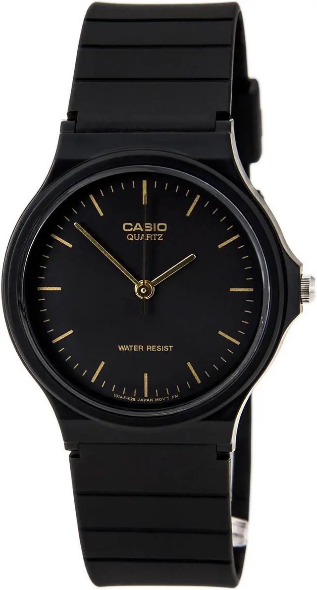 The Casio MQ-24-1E is a minimalist and practical timepiece designed for everyday wear. It features a black resin case and band, complemented by a black dial with gold-tone hands and markers, offering a sleek and versatile appearance suitable for various occasions. The watch is powered by a reliable quartz movement, ensuring accurate timekeeping. Its lightweight construction and simple design make it a versatile accessory suitable for various occasions. Additionally, the watch offers water resistance, providing protection against minor splashes.