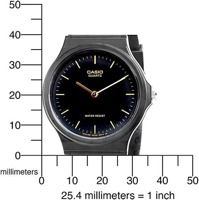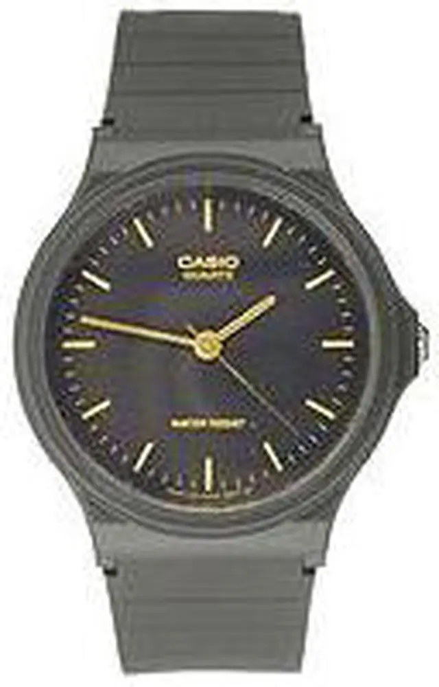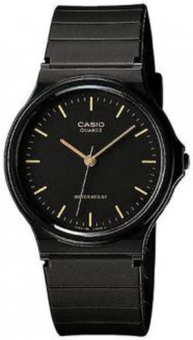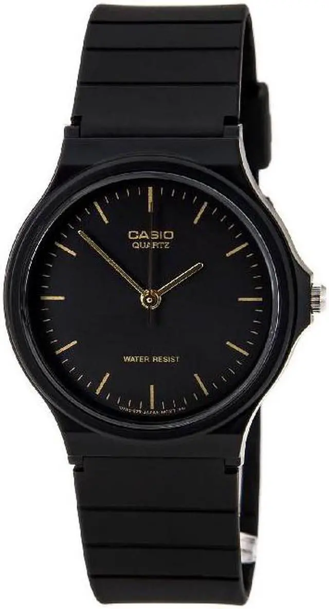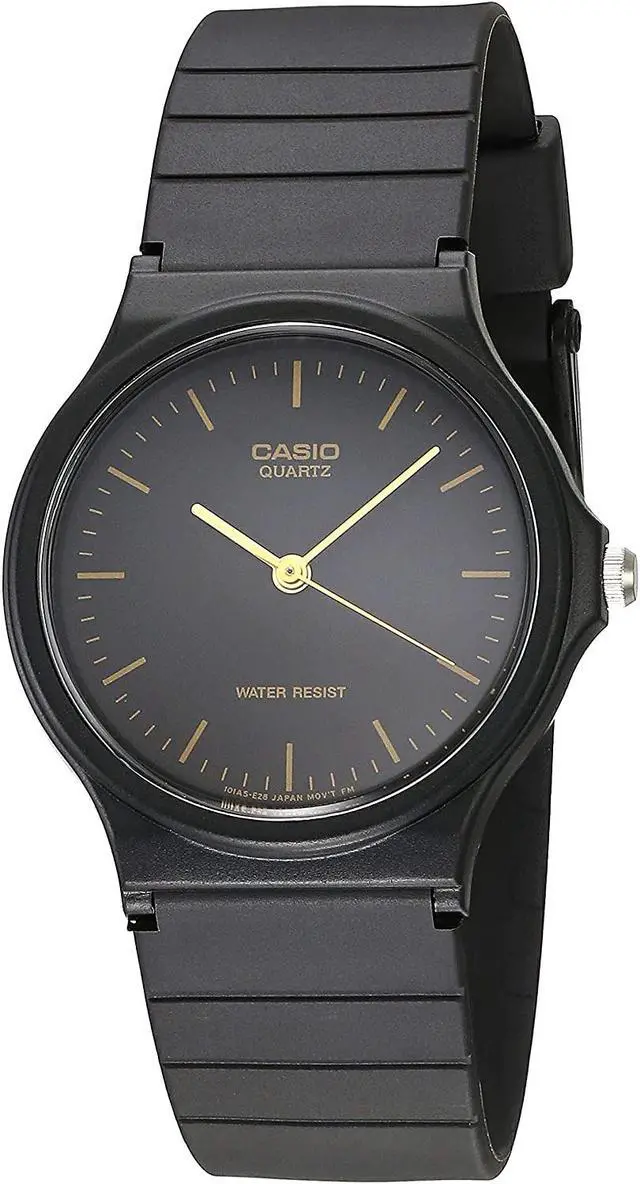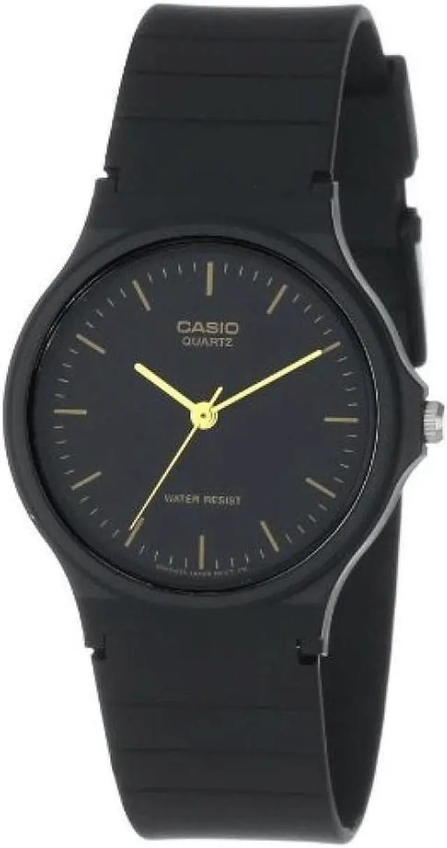 The Casio MQ-24-1E is a minimalist and practical timepiece designed for everyday wear. It features a black resin case and band, complemented by a black dial with gold-tone hands and markers, offering a sleek and versatile appearance suitable for various occasions. The watch is powered by a reliable quartz movement, ensuring accurate timekeeping. Its lightweight construction and simple design make it a versatile accessory suitable for various occasions. Additionally, the watch offers water resistance, providing protection against minor splashes.