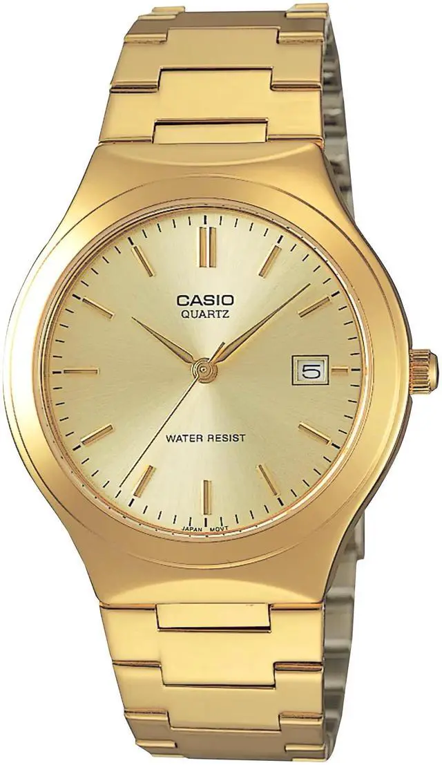 The Casio MTP-1170N-9A is a refined mens watch that blends modern simplicity with classic luxury. Its champagne gold-tone dial pairs perfectly with a polished gold-tone stainless steel bracelet for a seamless, sophisticated look. With quartz precision, water resistance, and a date display, this timepiece delivers timeless style and everyday dependability in one sleek design.
