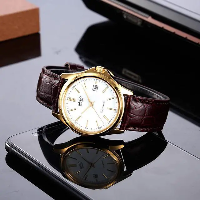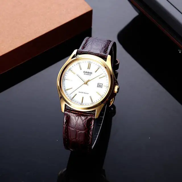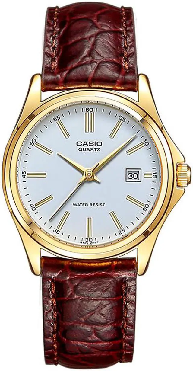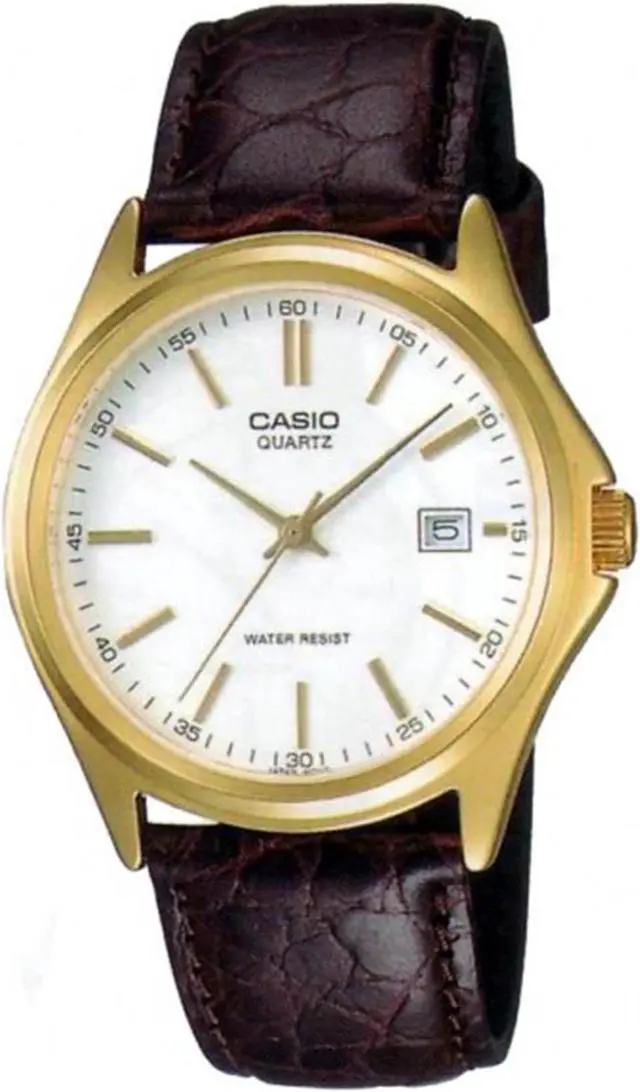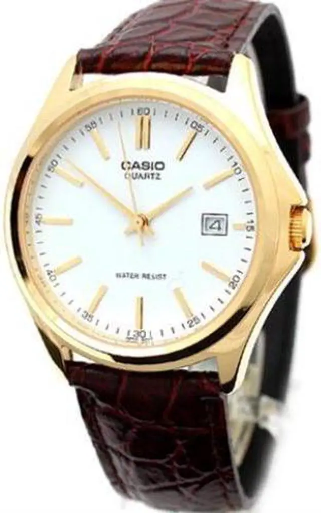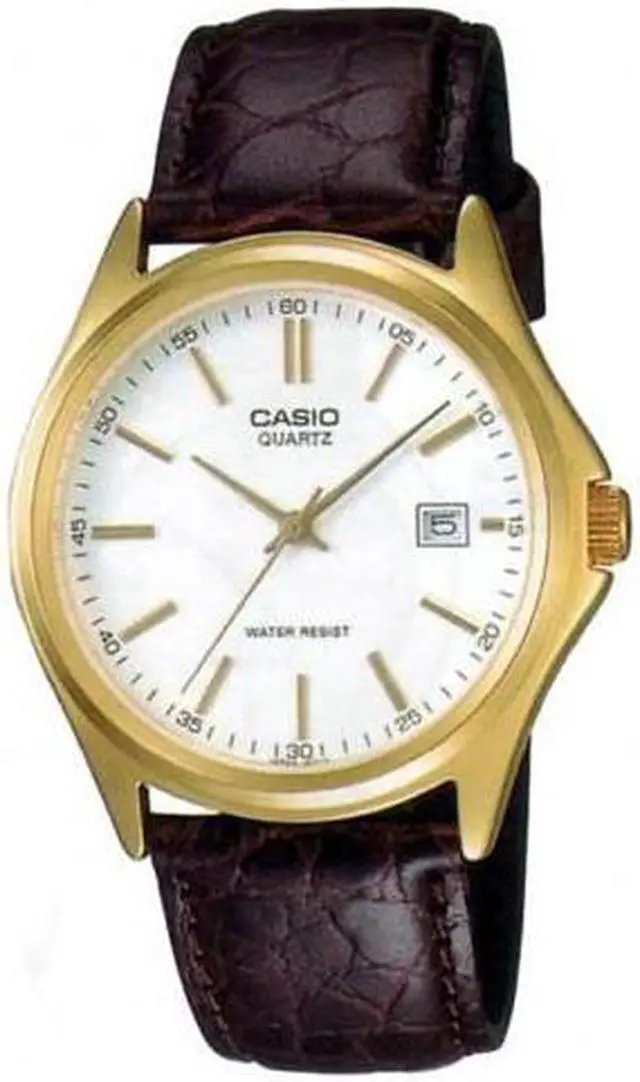 The Casio MTP-1183Q-7A blends classic design and everyday reliability in a refined timepiece. Its crisp white dial is accented by gold-tone hands and hour markers, creating a sophisticated contrast against the gold-tone case. The brown textured leather strap enhances its timeless appeal while ensuring a comfortable fit. Featuring a date display at 3 oclock and water resistance, this watch is both elegant and practicalideal for daily wear or special occasions.