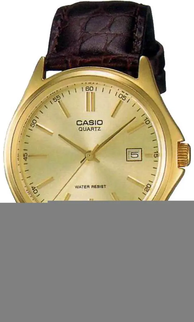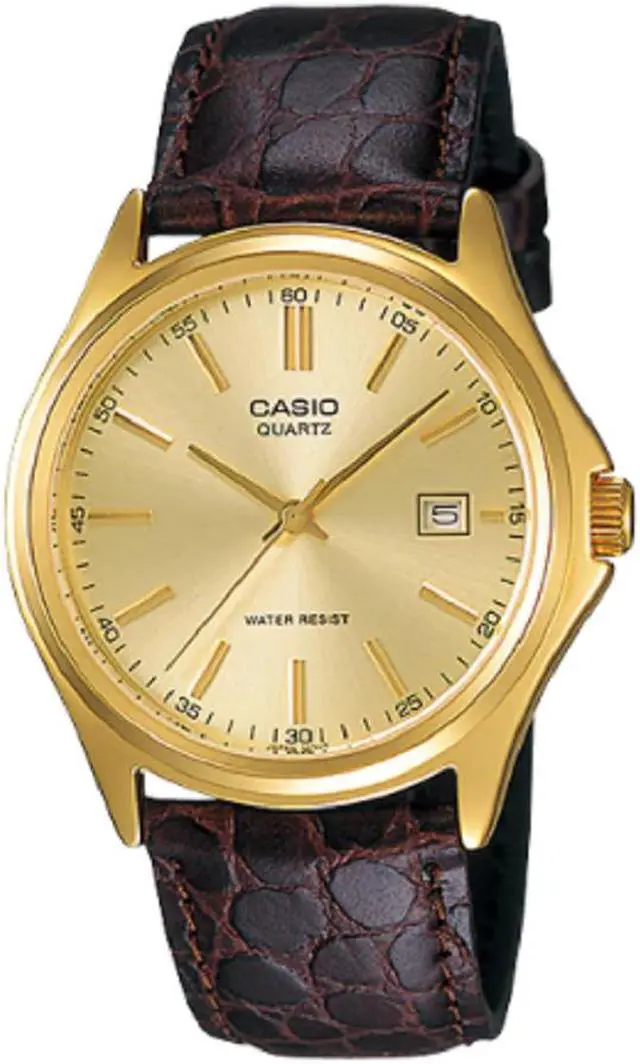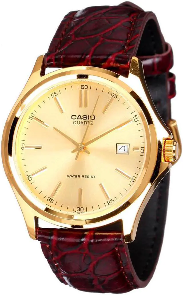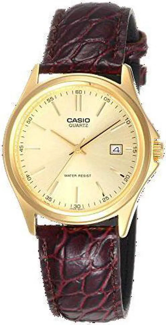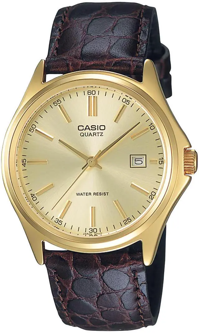 This Casio mens analog watch features a refined champagne dial paired with a gold-tone stainless steel case. Slim hour markers and a clean layout create a timeless, dress ready look. The brown leather strap adds warmth and contrast for everyday or formal wear. A precise quartz movement keeps time reliably throughout daily use. The integrated date window adds practical function without disrupting the elegant design.