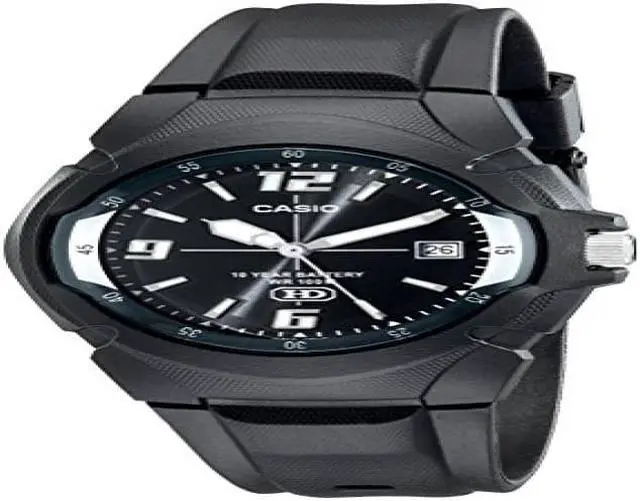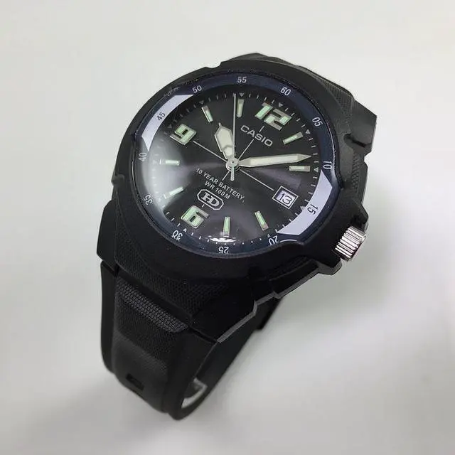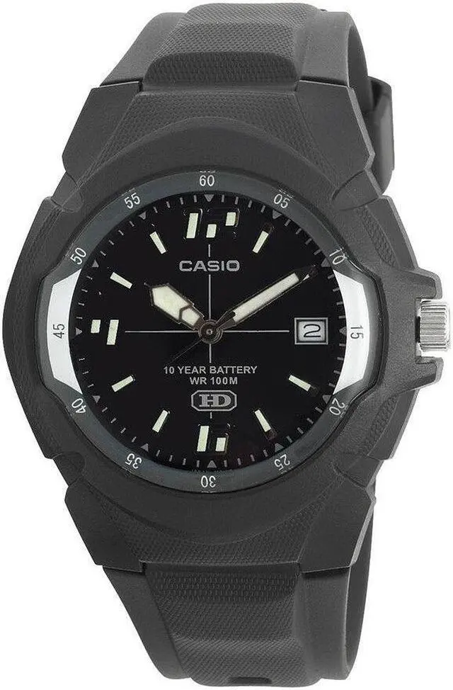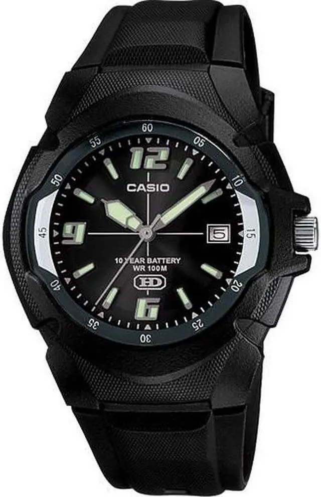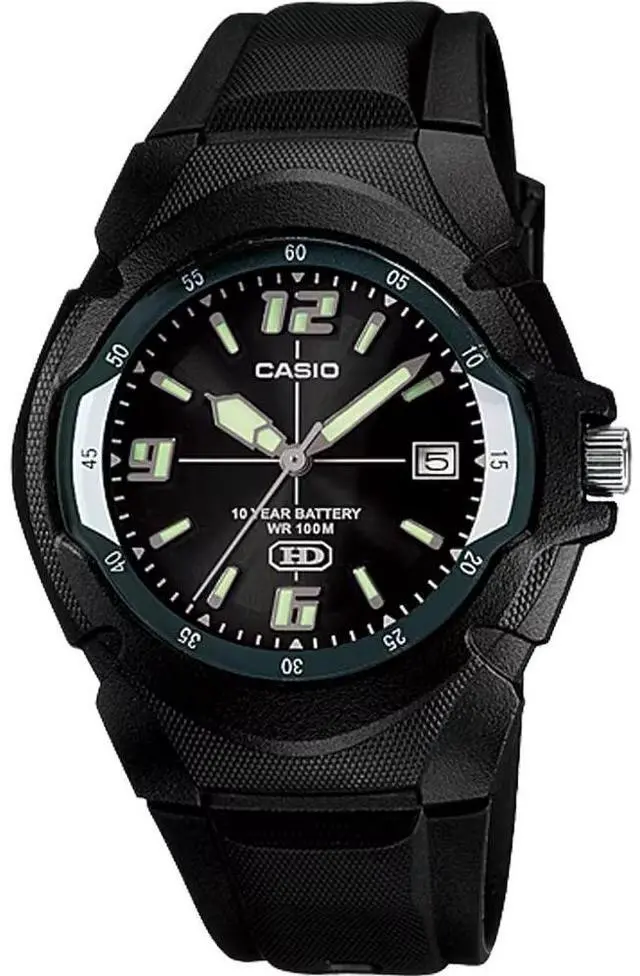 Gents Casio watch collection. Black resin case. Black resin strap. Black dial. Date display. Luminous hands.