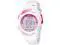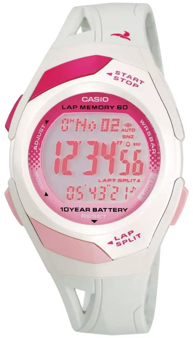 The Casio STR-300-7C is a digital sports watch designed for runners and fitness enthusiasts, combining functionality with a sleek design. It features a white resin band and case with pink accents, offering a stylish and comfortable fit for active users. Equipped with a front-button activated 1/100th second stopwatch and a 60-lap memory, the watch allows athletes to track their performance with precision and store lap data for later review. The pacer signal and distance calculation functions assist in maintaining desired paces and measuring distances covered during workouts. With a 10-year battery life, users can rely on long-term performance without frequent battery replacements.