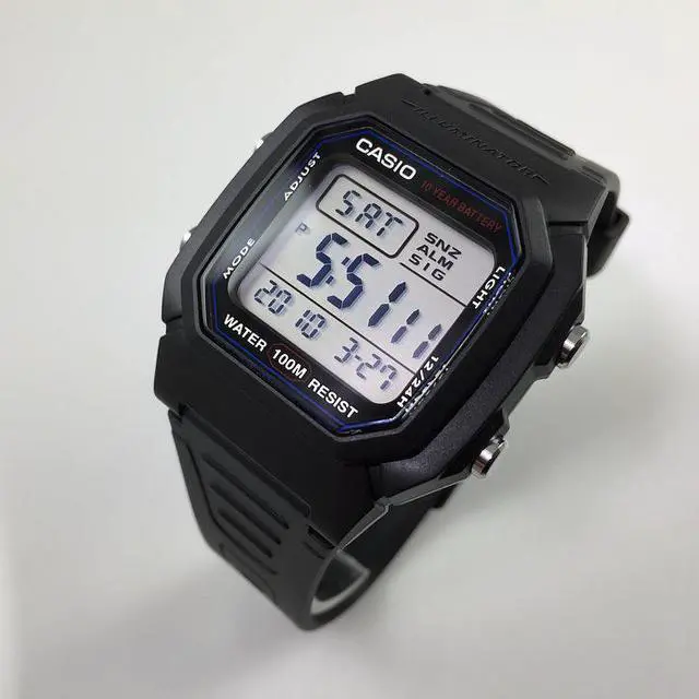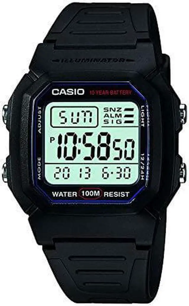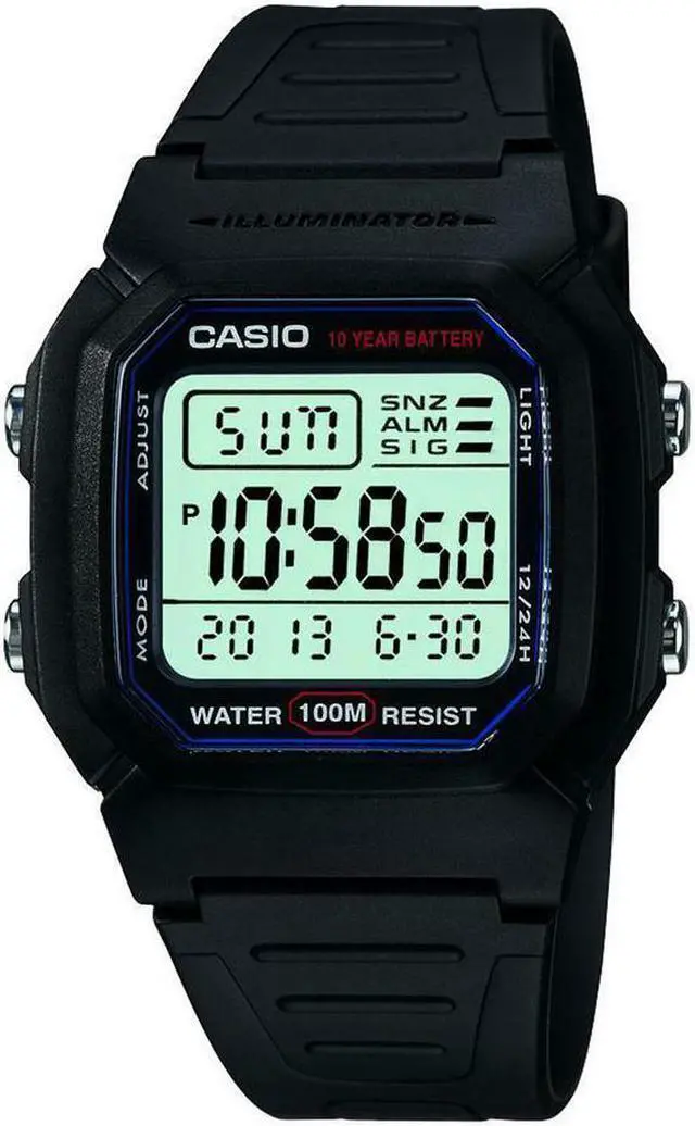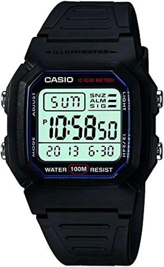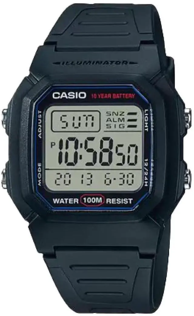 The Casio W-800H-1AV is a classic digital watch known for its durability and practical features. Crafted with a black resin case and strap, it offers a lightweight and comfortable fit, ideal for daily wear. The watch boasts a 10-year battery life, minimizing maintenance concerns for the user. Its 100-meter water resistance makes it suitable for swimming and snorkeling, enhancing its versatility. Equipped with an LED backlight, the display remains readable in low-light conditions. Additional functionalities include dual time zones, a 1/100-second stopwatch, a multi-function alarm with a snooze feature, and a full auto-calendar pre-programmed until 2099.