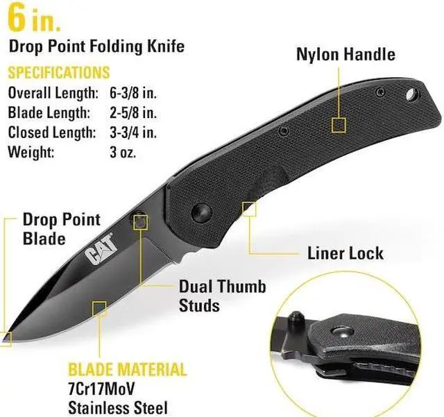 Weight: 3 ounces; 7Cr17MoV Stainless Steel blade with black finish and lightweight Nylon handle; Stainless Steel frame resists corrosion and liner lock ensures blade stays open during use 8 INCH FOLDING KNIFE WITH SEAT BELT CUTTER AND GLASS BREAK: Overall