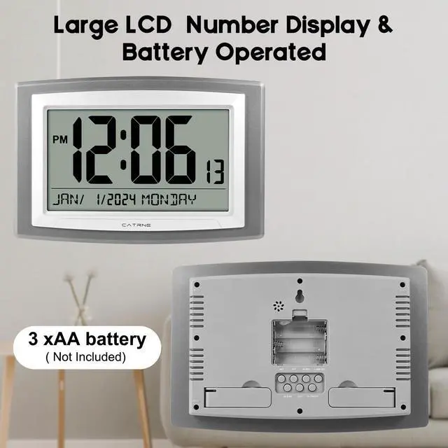 Battery Operated Digital Wall clock - This digital clock is powered by 3 AA batteries (not Included), you can put the clock wherever you like. There are two keyholes for easy wall mounting and a fold-out backstand for tabletop or shelf placement.