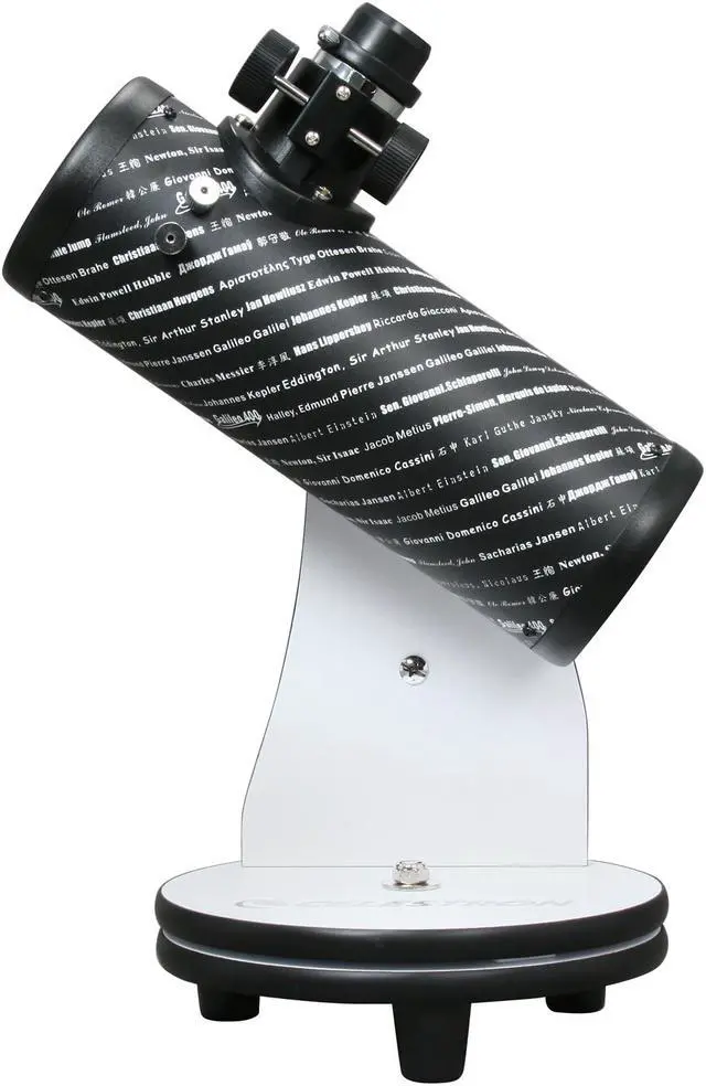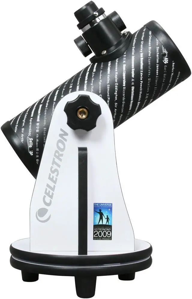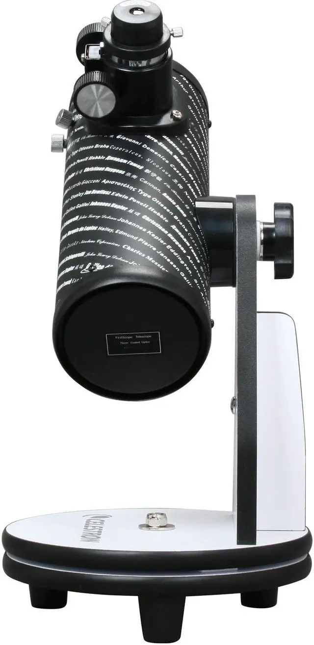 Compact DesignWeighing merely 69 ounce, the Celestron FirstScope features a portable table-top design, making it a perfect travel companion, whether you are camping in the woods, or relaxing under the stars in your own backyard. Set-up is a breeze thanks to its minimalist design. What worth a mention is that the Celestron FirstScope pays tribute to Galileo Galilei and many of history’s most notable astronomers and scientists by displaying their names around the optical tube.