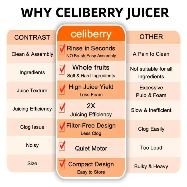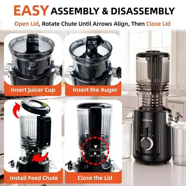 5.3 WIDE CHUTE & BATCH JUICING: The celiberry juicer features a 5.3 large chute for whole fruits and a 68 oz hopper for less cutting. Add your entire recipe at once to the self-feeding system for hands-free operation. Save prep time, enjoy easy batch juicing, and get freed up to multitask.The compact juicer saves countertop space.