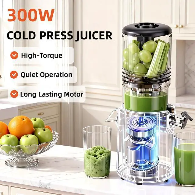 300W HIGH-TORQUE MOTOR: Equipped with a professional-grade 300W quiet motor, this cold press juicer delivers the high torque needed to smoothly handle a wide variety of daily producefrom soft fruits and leafy greens to hard vegetableswithout jamming or stalling. Its built for long-lasting use, handling up to 20 minutes of continuous juicing.