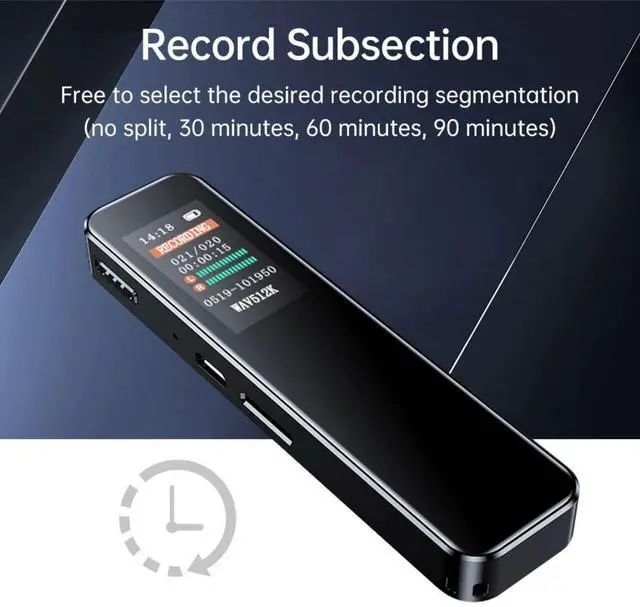 This recorder adopts a TFT color screen with clear display, supports headphone connection for private listening, and is equipped with a built-in speaker for convenient playback. It also supports voice-activated recording and segmented recording options (30 minutes/60 minutes/90 minutes) for your convenience.