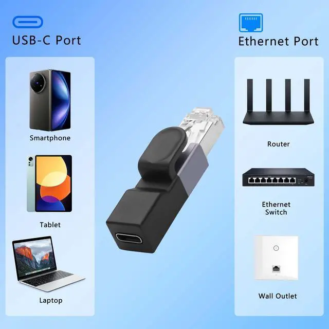 USB C to RJ45 Network Internet LAN Adapter, using RJ45 male to USB-C female design, more convenient and quick. You just need to connect your daily USB A-C or USB C-C charging cable to the router to access the Internet for your cell phone or laptop.