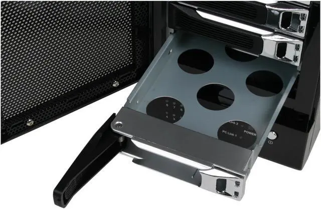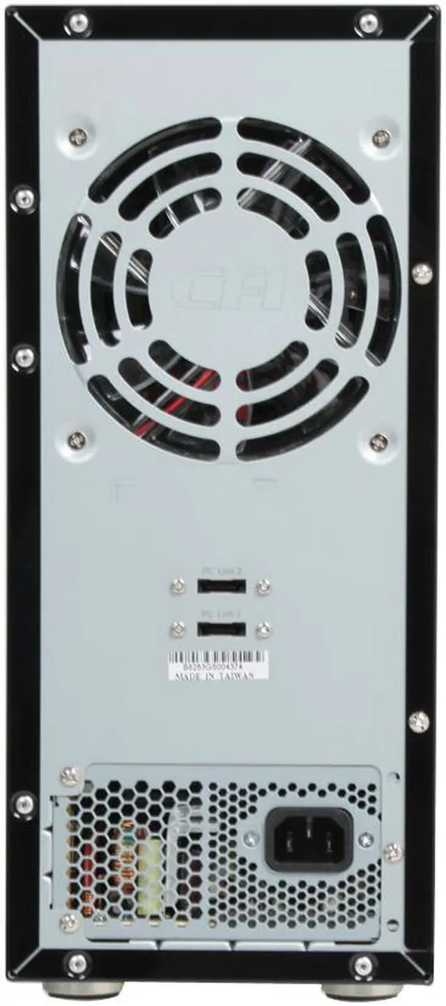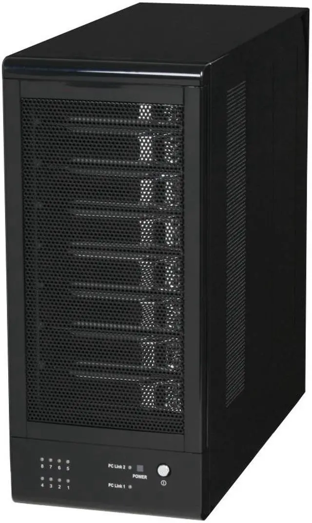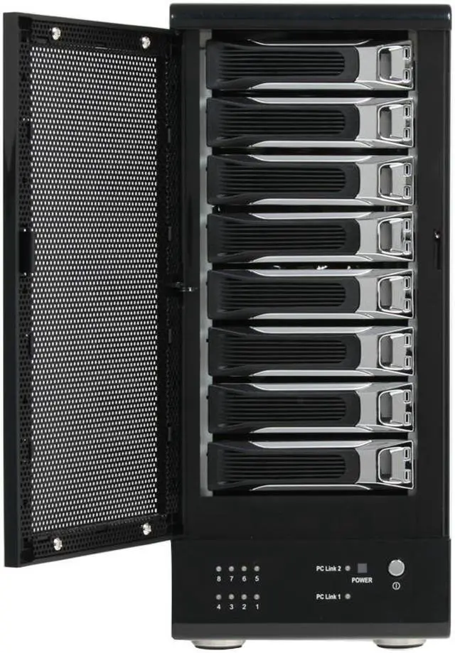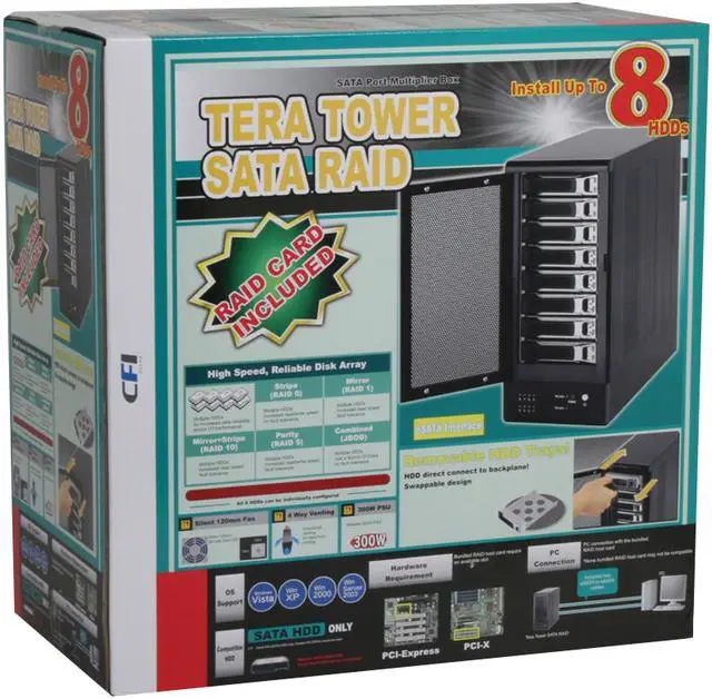 | Features | Black Silicon Image port multiplier, PCI-Express RAID controller. 8 x heavy duty hot swappable tray with handle Vented housing design, 120mm ball-bearing fan. Vented metal-mesh drive door |