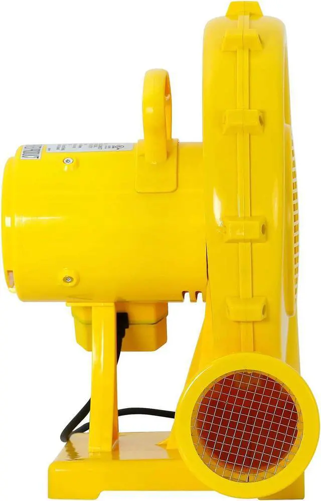This premium commercial-grade bounce house blower by Cloud 9 is for use with outdoor bounce houses, water slides, obstacle courses, jumpers, and other inflatables. It has a 4-1/2" (outside diameter) air outlet for a universal fit, and its strong and efficient 1, 200 watt motor produces more CFM (Cubic Feet per Minute) per watt than other blowers on the market. This unit is constructed with a durable composite housing, a convenient top-mounted handle, two ground stake holes (stakes included), and integrated protective screens that cover its air intake and outlet.