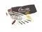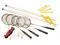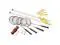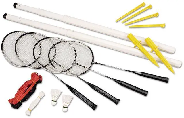 4 Deluxe steel badminton rackets. Heavy-duty plastic uprights, 20' net, 2 shuttlecocks, 2 pole anchors, and 4 ground stakes for support. Comes in a reusable black carrying case.